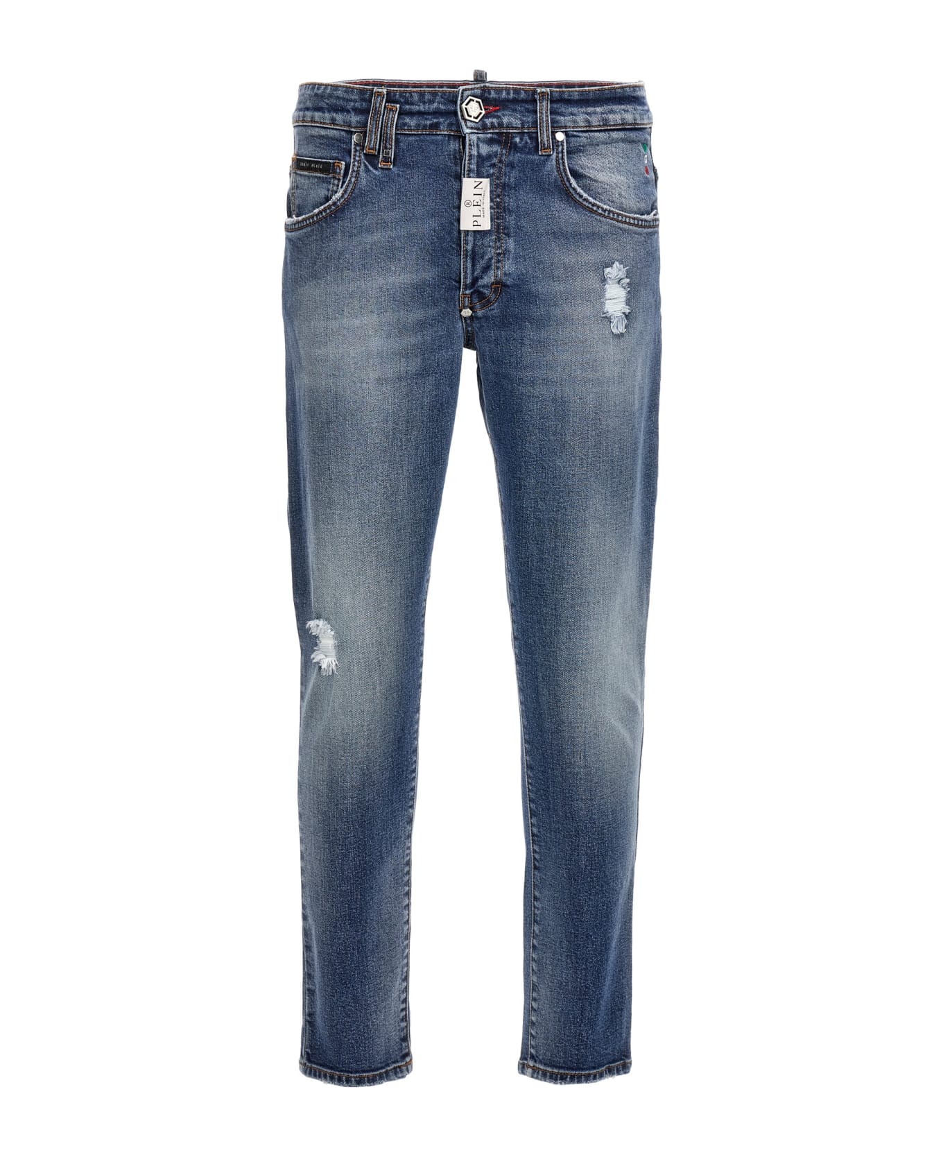 Stone wash stretch cotton denim jeans featuring used effect details, a button closure, five pockets, and a logo plaque at the back.