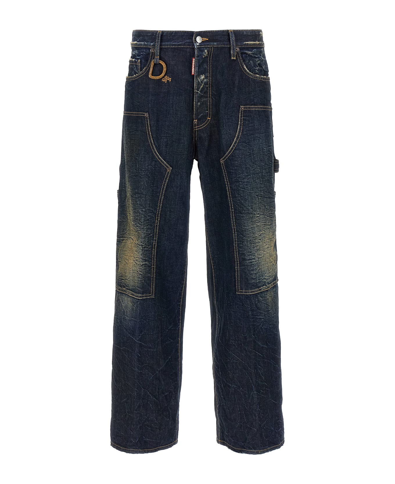 'Loose Carpenter' cotton denim jeans with dusty distressed treatment, contrast stitching, front button closure, vintage-effect metal charm with front logo embroidery, straight leg, back leather logo tag.