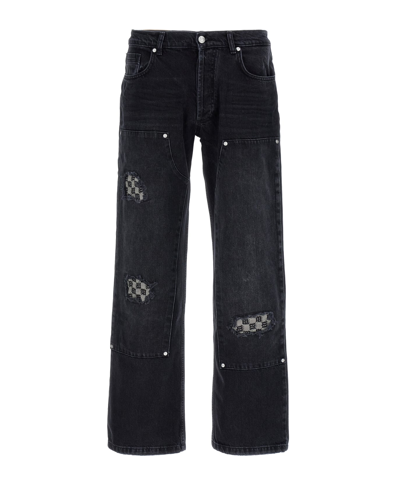 'Monogram Carpenter' cotton denim jeans with button closure, five pockets, used-effect details with logo print inserts, leather logo tag.