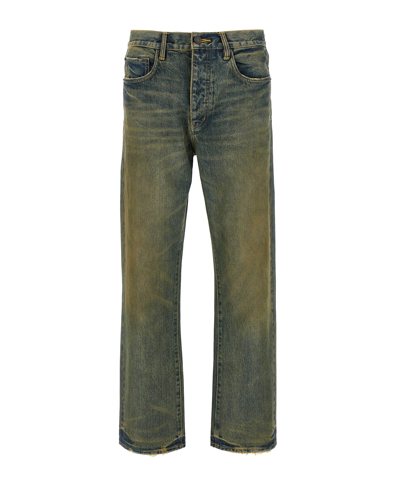 'P011 Sand Dune' covered delavé cotton denim jeans with medium waist, straight leg, button closure, five pockets, leather logo label at the back. This product is made with craft techniques, possible variations between one item and another are to be considered characteristics of the product.