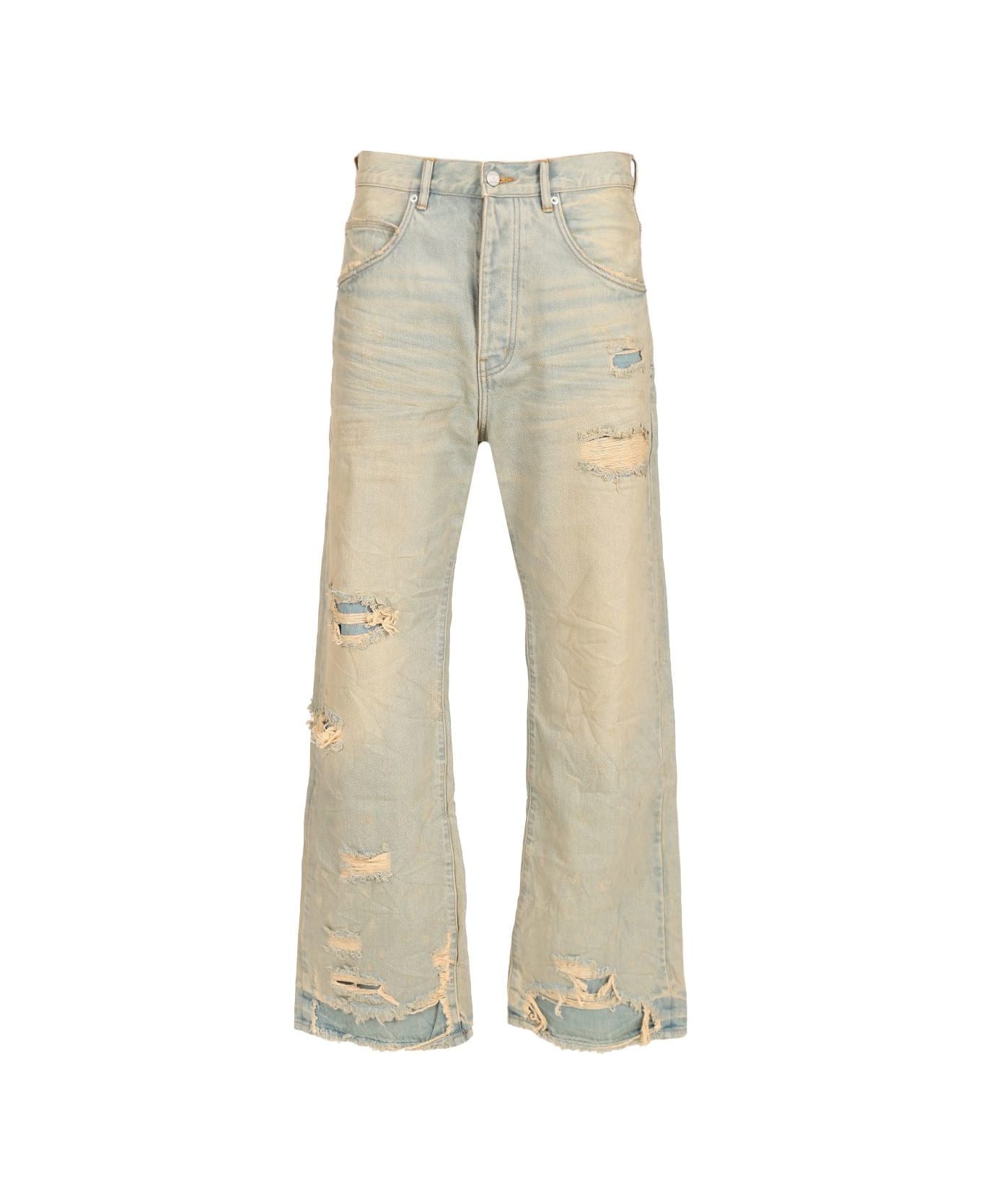 "P018" jeans in cotton denim by Purple, five pockets with button fastening and reinforced belt loops, details of rips and wear, leather patch, a drawstring on the back pocket and a logo label. Mid-rise, Baggy fit