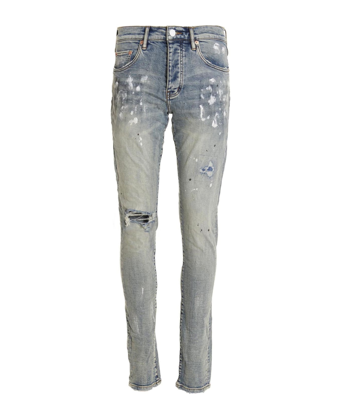 Cotton denim jeans with paint details, all-over used effect, crumpled effect, button closure, five pockets, low waist style with slim leg. This product is made using handmade techniques, possible variations between one item and another are to be considered characteristics of the product.