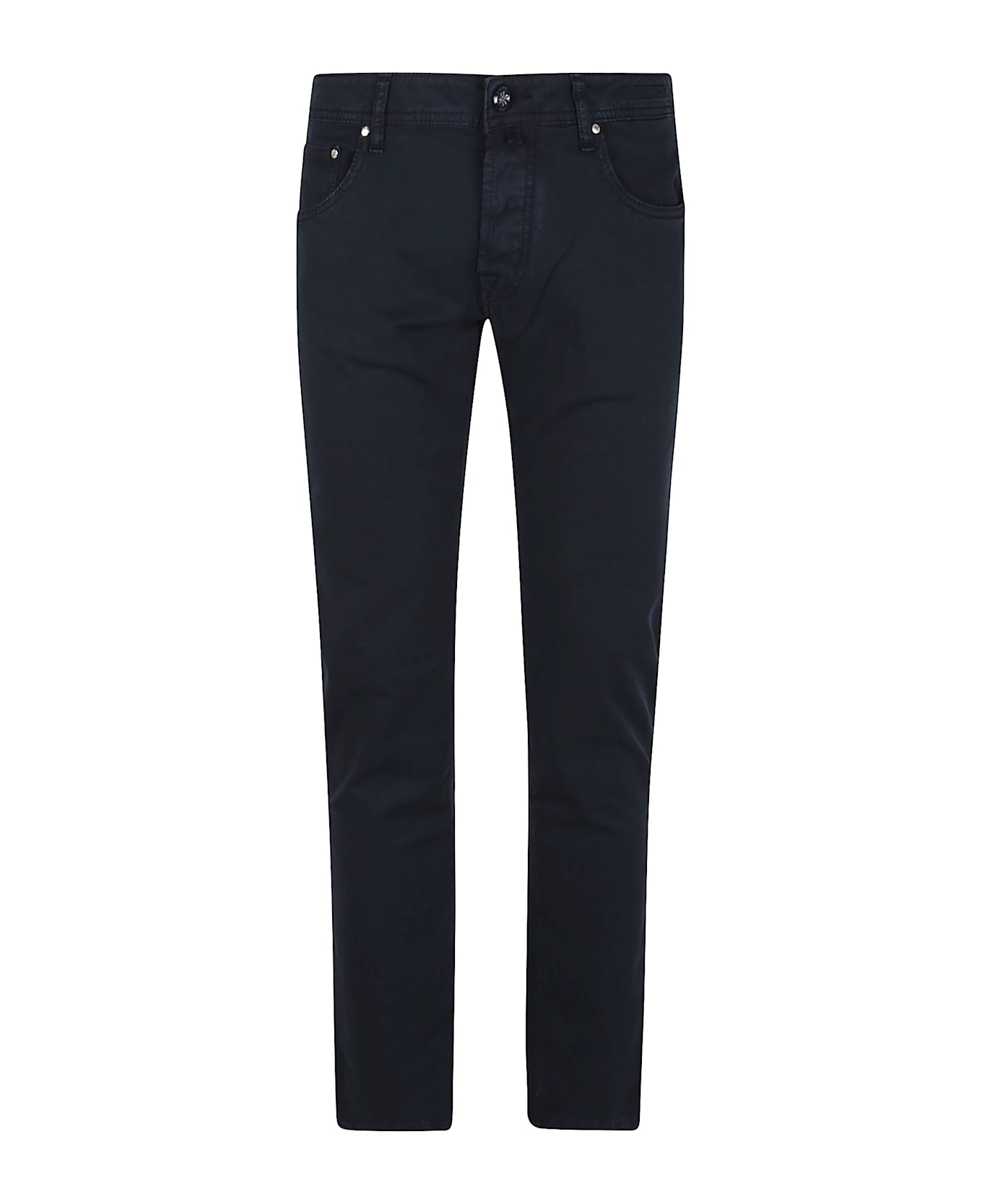 Power stretch cotton trousers by JACOB COHEN. Navy blue enamel convex button fastening; belt loops; five pockets. Featuring a laser-etched logo pony back, bandana and spool of thread and scented with the exclusive Jacob Cohën fragrance.