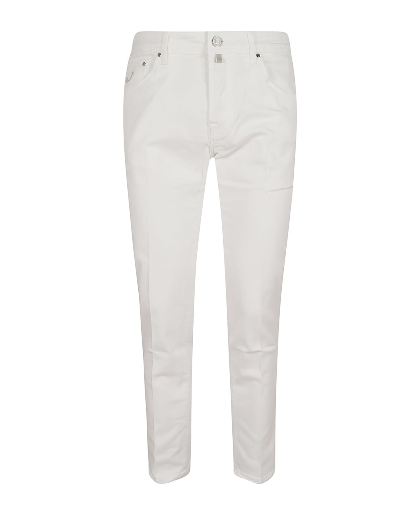 optical white cotton blend jeans with button closure, belt loops, embroidered logo on the front, classic five pockets, logo patch on the back, slim cut and cropped length.