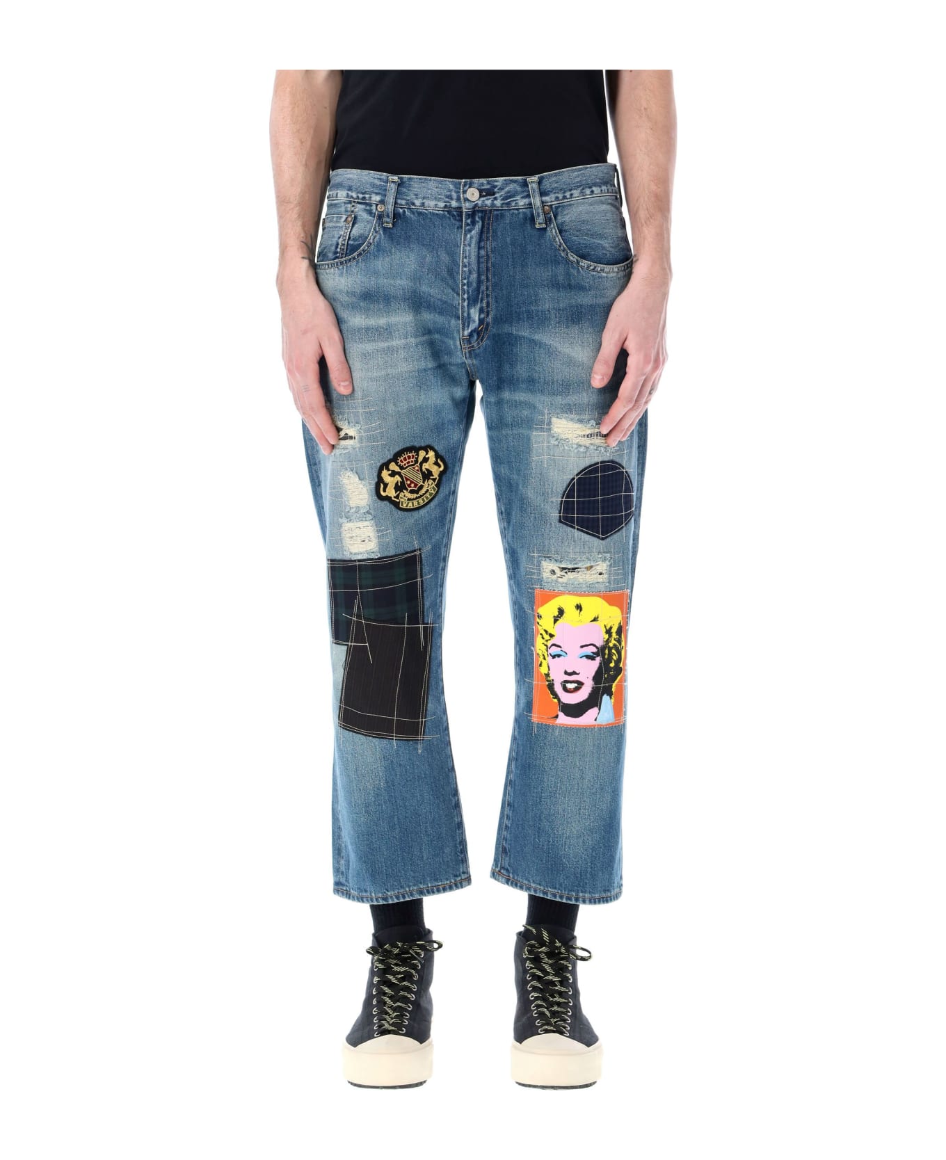 Cotton Patchwork Denim Pants By Junya Watanabe. Featuring: Button And Zip Fastening Belt Loops Five Pockets Straight, Crop Leg Ripped Details Multiple Patches At Front And Back Model Is 1,90 M Tall And He Is Wearing Size Xl