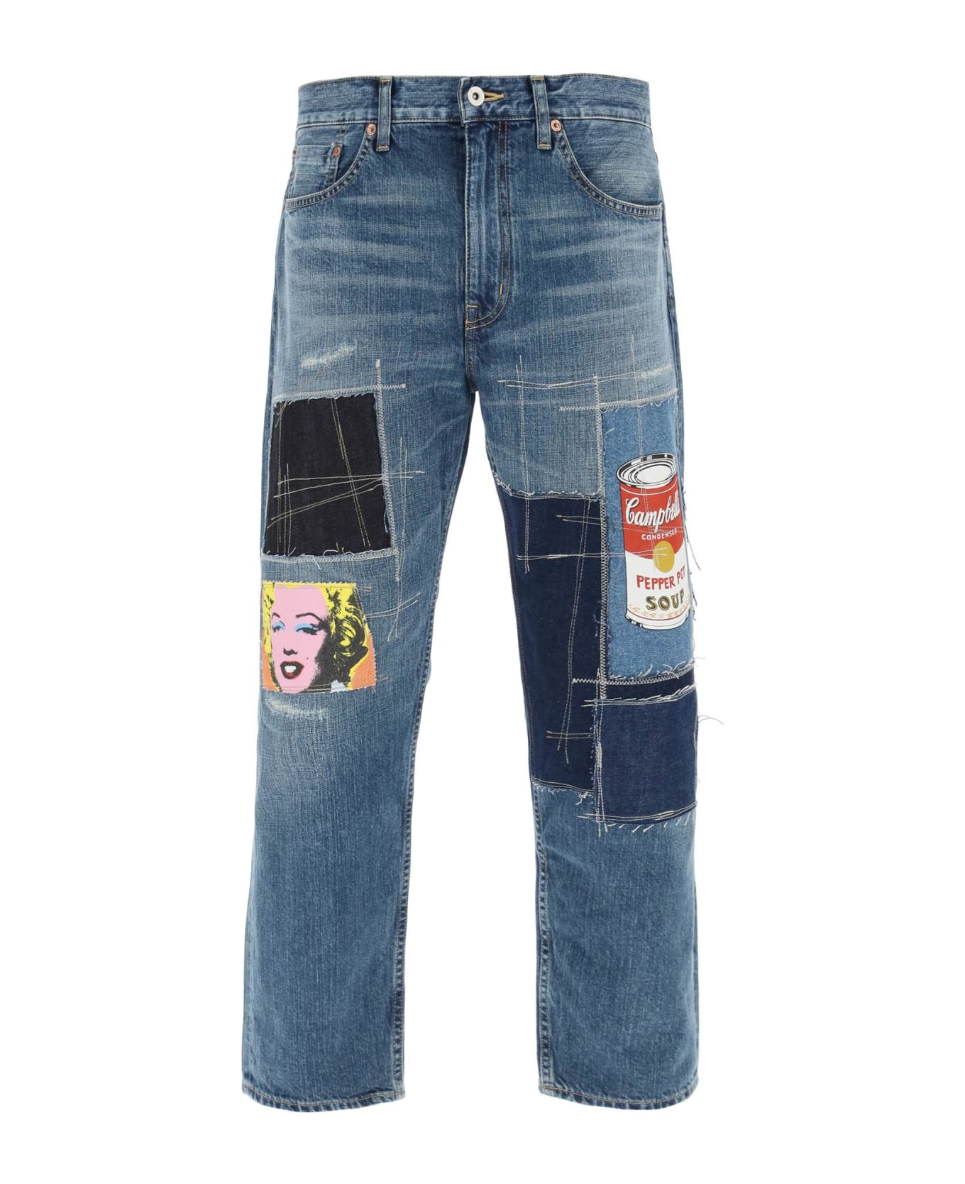 Five-pocket jeans from the Junya Watanabe Man collection, embellished with topstitched and printed patchwork detailing at front. Cut in a low rise with cropped length, they feature belt loops and a zip fly with branded button. The model is 187 cm tall and wears a size L.