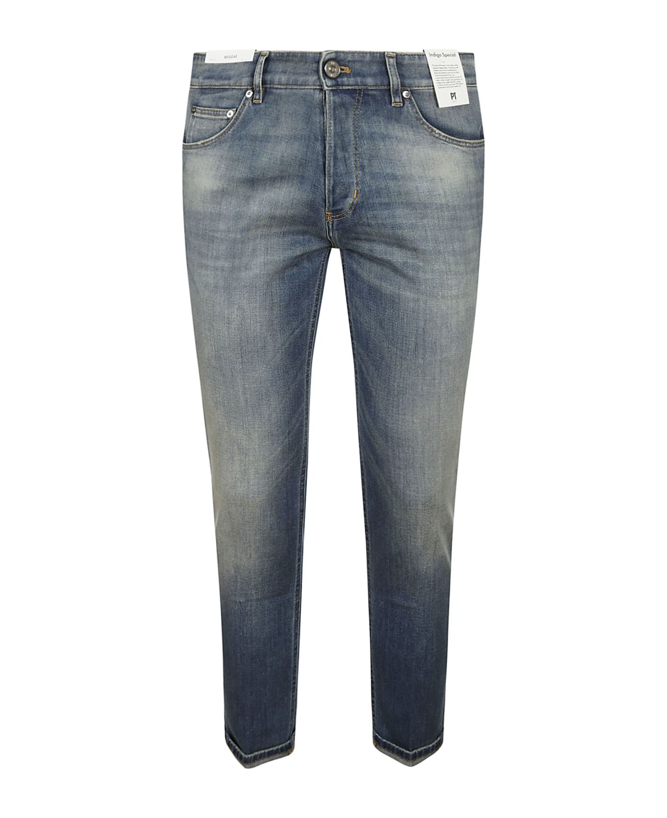PT Torino Denim in blue cotton, five pockets, logo patch, button closure, washed effect. Composition: 92% Co , 6% Em , 2% Ea