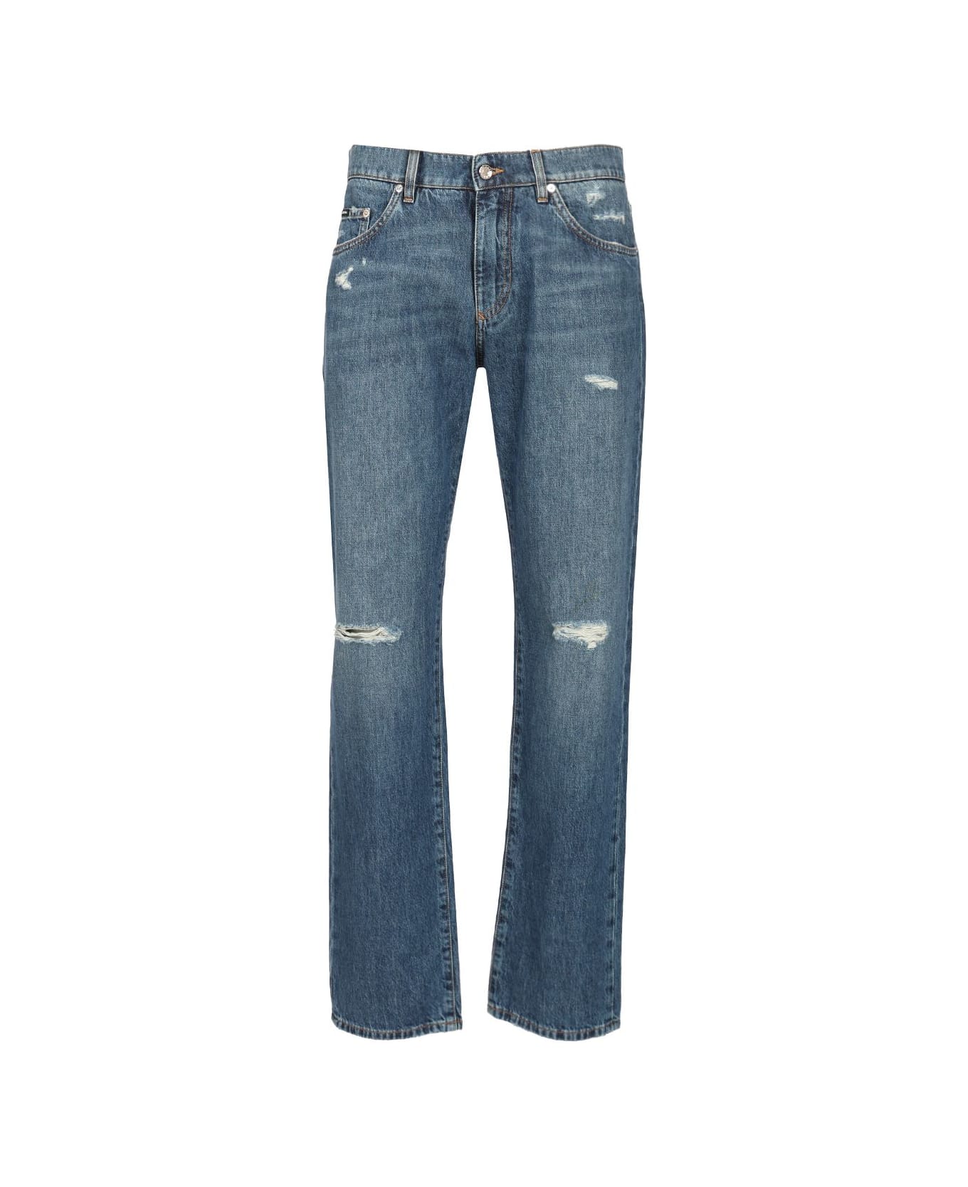 Regular fit jeans in cotton with medium wash rips and metal logo patch on the back pocket