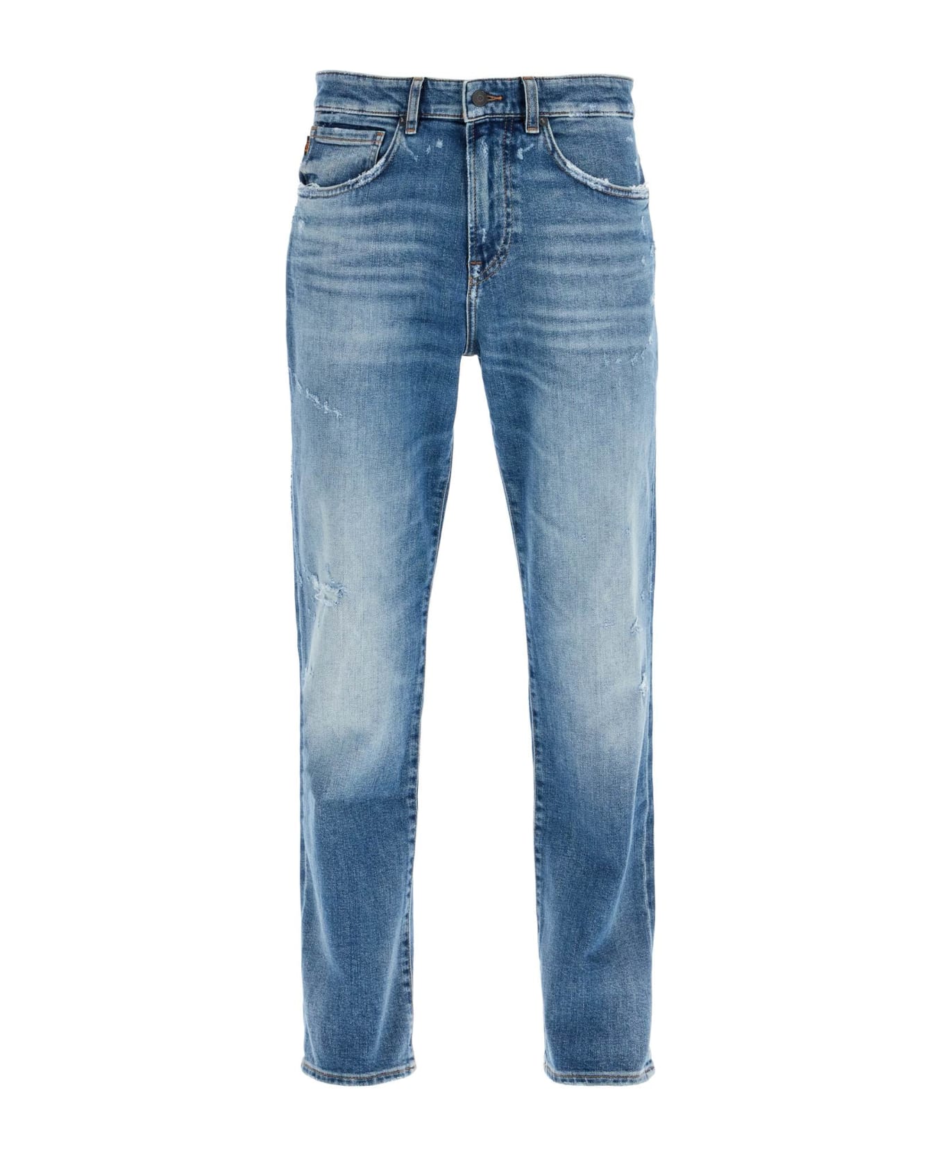 Boss five-pocket jeans in stretch denim with distressed finishes, featuring a regular fit and low waist. Belt loops, zip closure and button. The model is 187 cm tall and wears size 31.