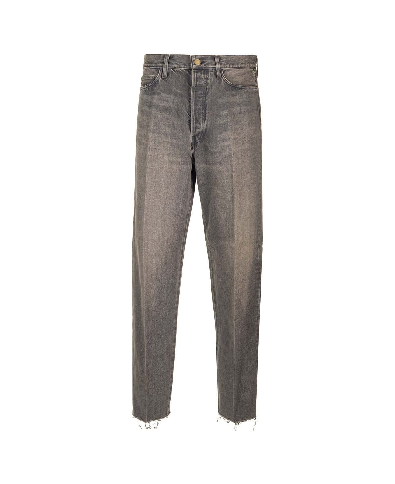 Relaxed 5-pocket jeans from Fear of God in vintage black Japanese denim, featuring a straight leg, antiqued brass hardware and a raw ankle hem.