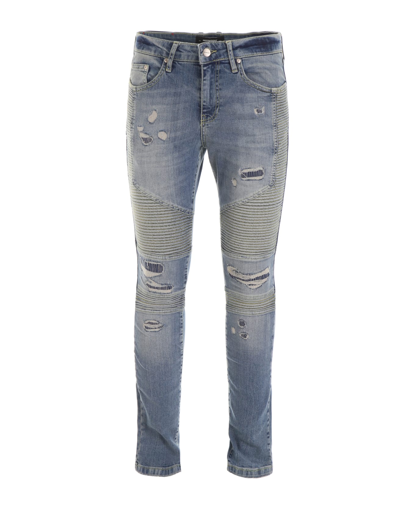 Represent stretch cotton jeans with five pockets. They feature intentionally ripped areas, biker seams, zip and button closure, leather logo patch on the back. Model height is 183 cm and he is wearing a size 31.