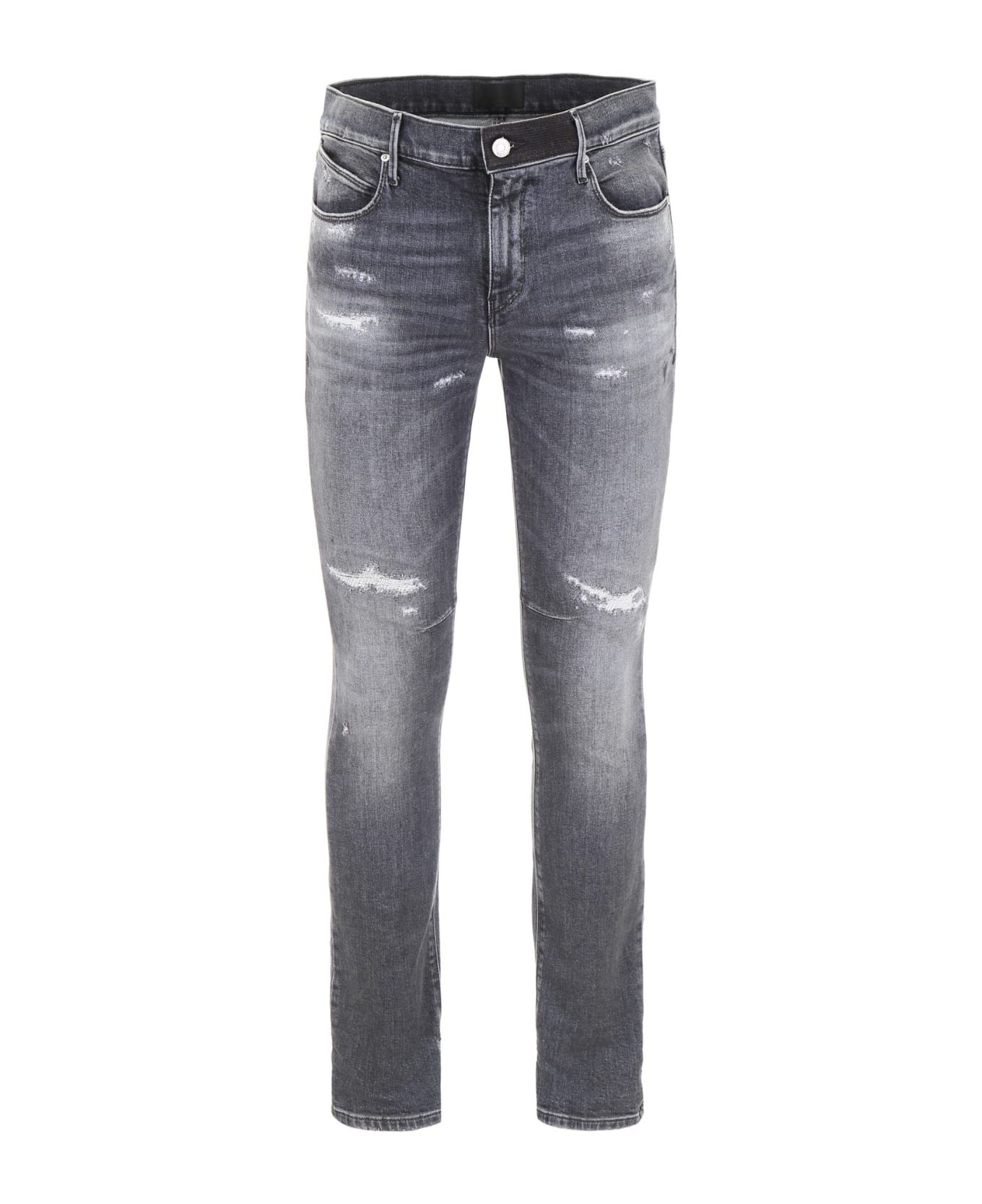 RtA grey wash denim jeans with intentionally crinkled and stitched areas. They feature zip and logo button closure, five pockets, leather logo label on the back. Model height is 183 cm and he is wearing a size 31.