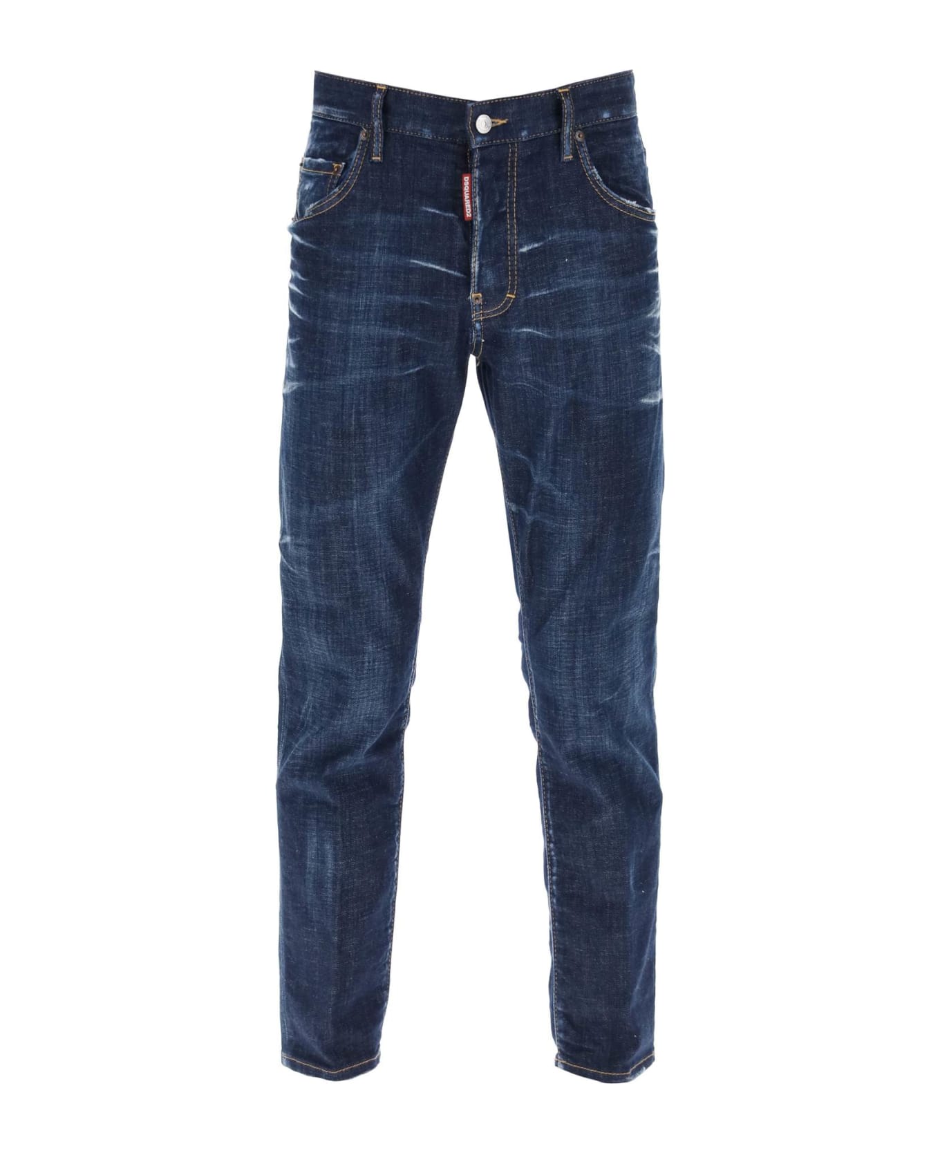 Dsquared2 five-pocket jeans made from used-effect dark wash stretch denim. The Skater style is cut to a slim fit with tapered leg and low-rise waist. This piece is finished with belt loops and the signature logo label on the button fly. The model is 187 cm tall and wears a size IT 48.