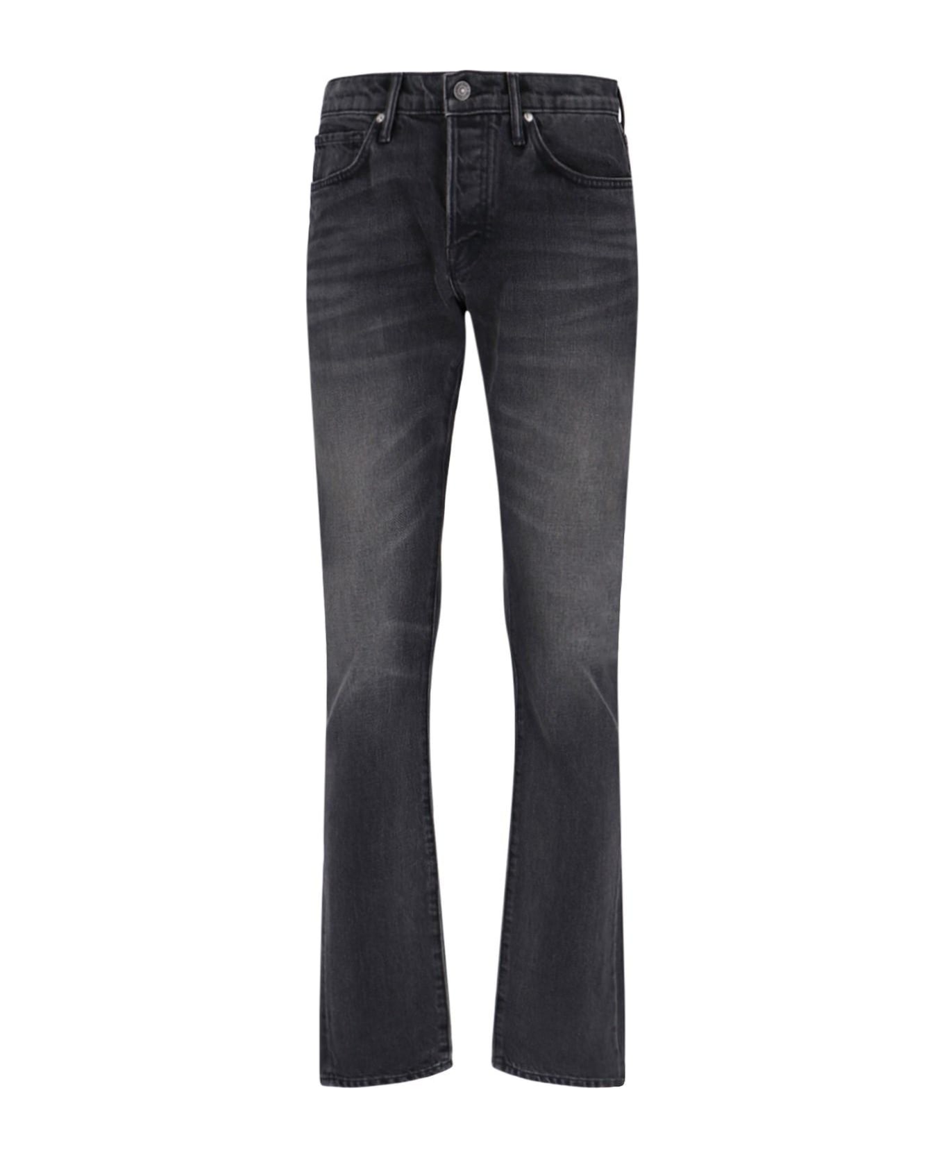 Tom Ford slim fit jeans in black cotton with distressed wash, belt loops, zip and button closure, five pockets, white logo label on the side, back logo patch, straight hem.