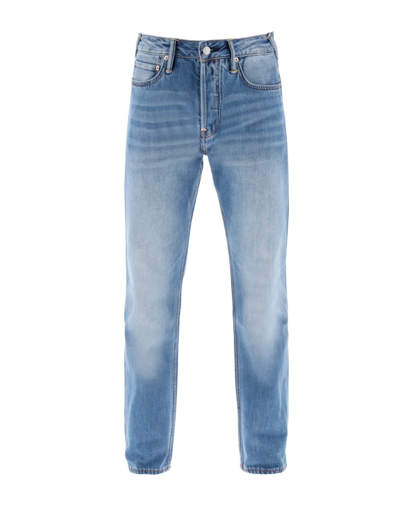 Evisu five-pocket jeans crafted in pure cotton denim with light vintage wash. Characterized by Graffiti Daruma and Seagull prints on back pockets, this garment features belt loops and button fly. Embellished with logoed leather jacron on the back. Slim fit with tapered leg. The model is 187 cm tall and wears size 31.