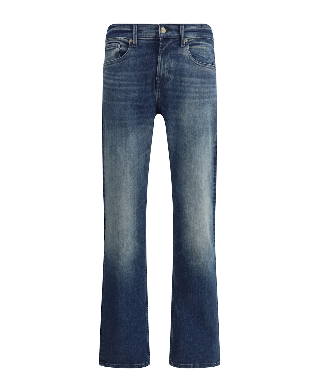 Slimmy largo jeans in cotton by 7for. the front closure is zipper and button, while belt loops on the waistband allow a belt to be added for a customizable fit. the style is a five-pocket, with two side pockets, a coin pocket and two back pockets. these jeans combine a slim fit with a wider end, offering a modern and versatile look.