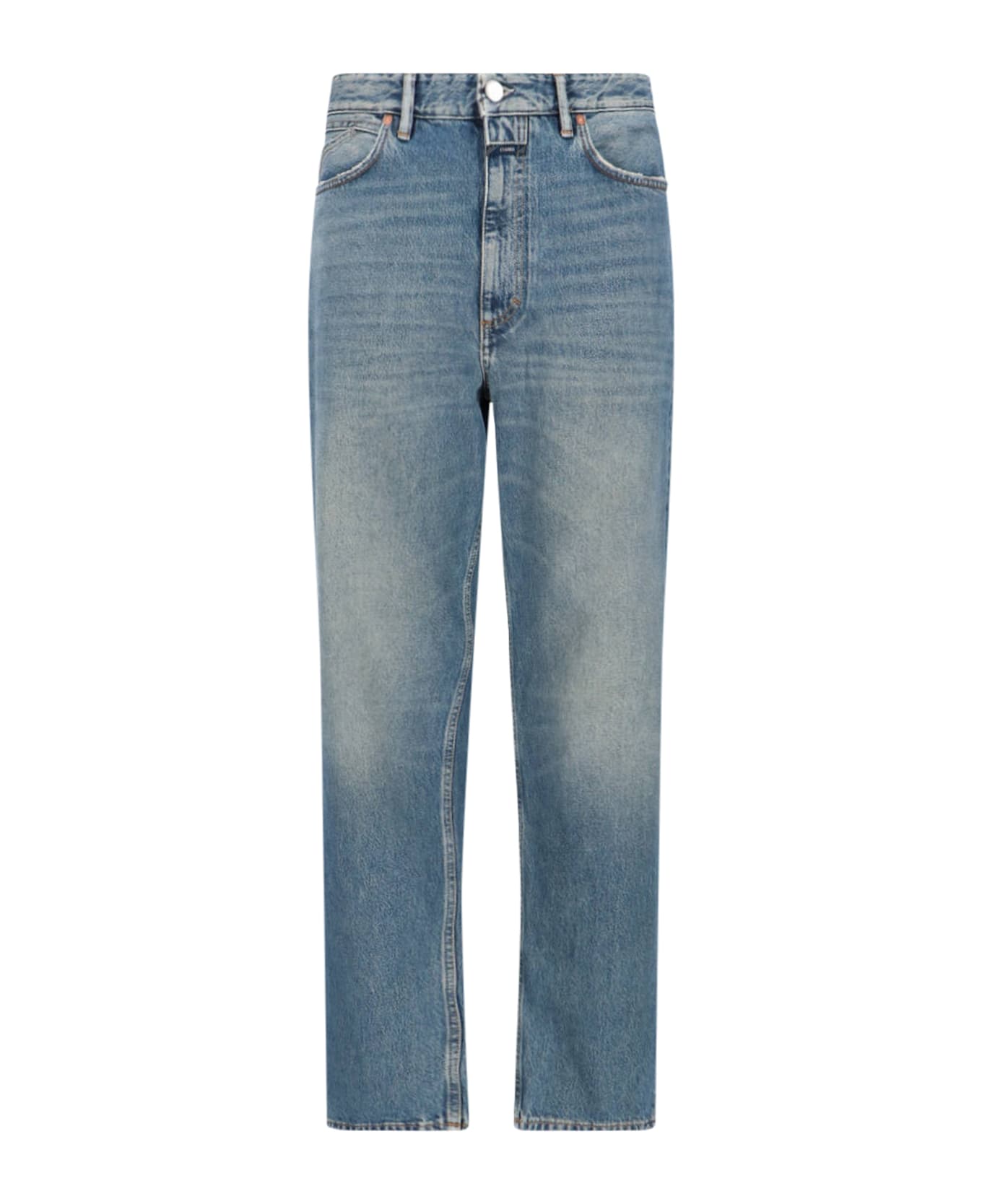 Closed straight 'Springdale Relaxed' jeans in blue denim with distressed wash, mid waist, belt loops, button and zip closure, logo label on flap, five pocket design, black logo patch on the back, straight leg.