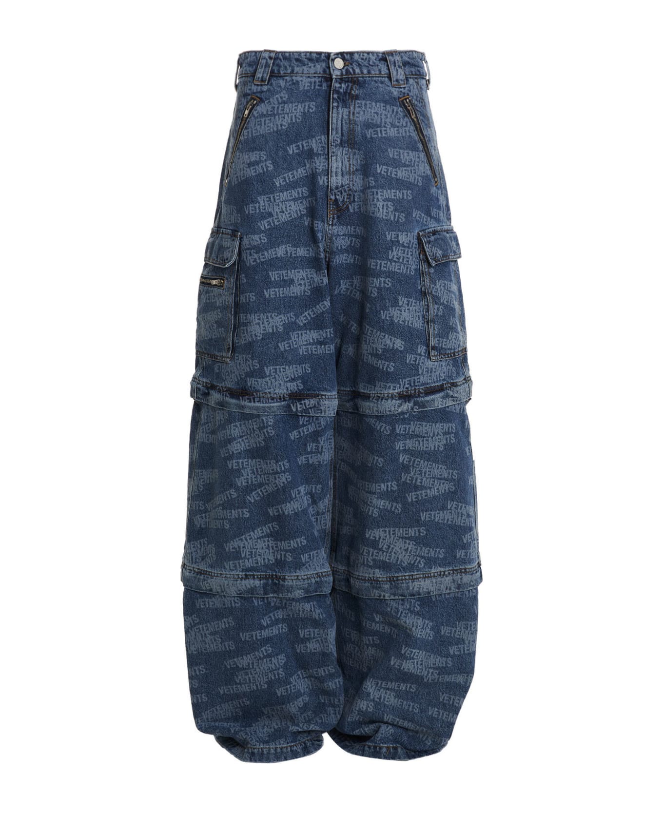 'Stamped Logo Big Shape Transformer' cotton denim jeans with all-over logo print, wide leg, zip and button closure, pockets, zip details, detachable bottom part with zip and leather logo tag. Composition: 100% cotton