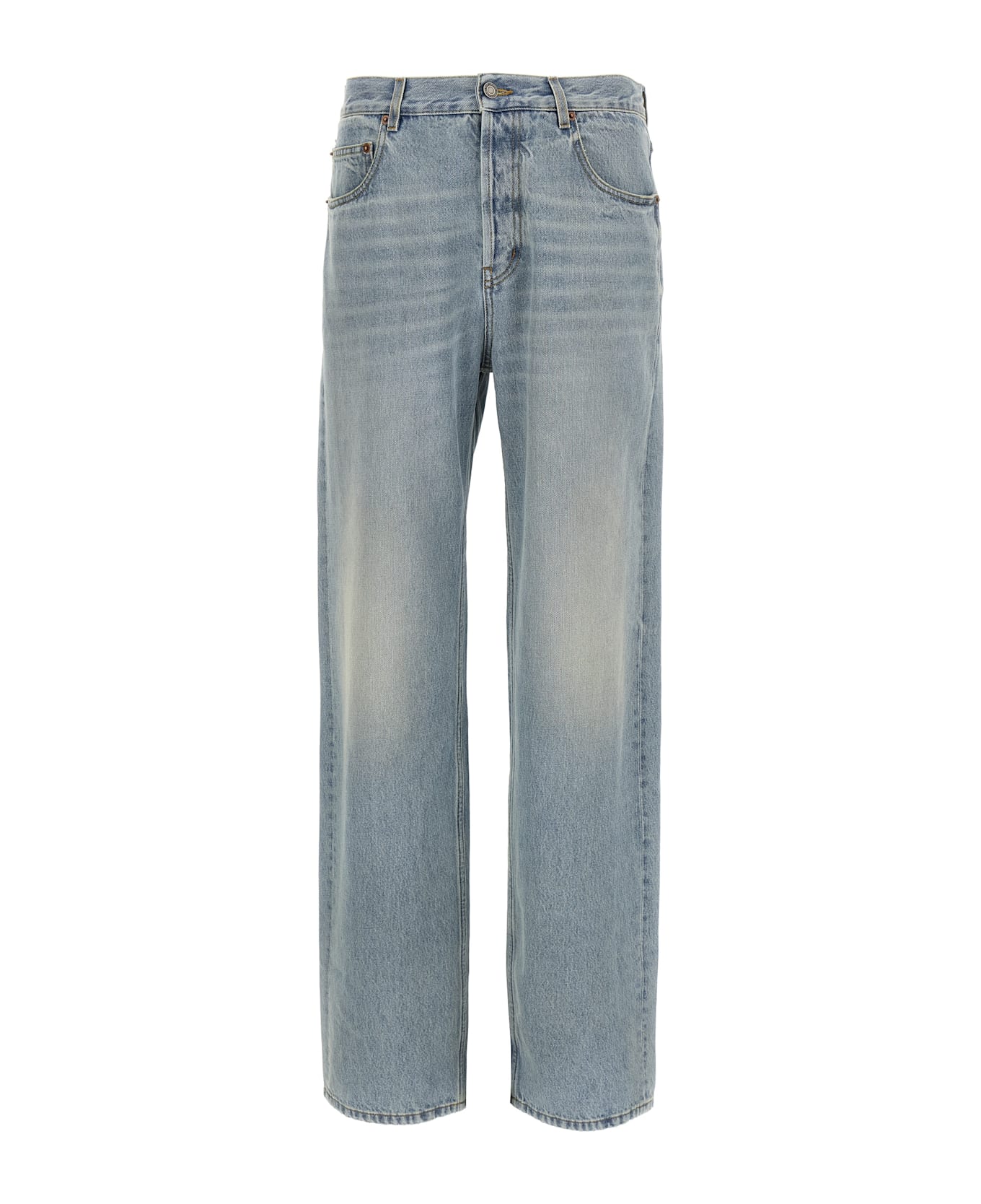 Used-effect stonewashed cotton denim jeans with mid waist, front button closure, five pockets, leg