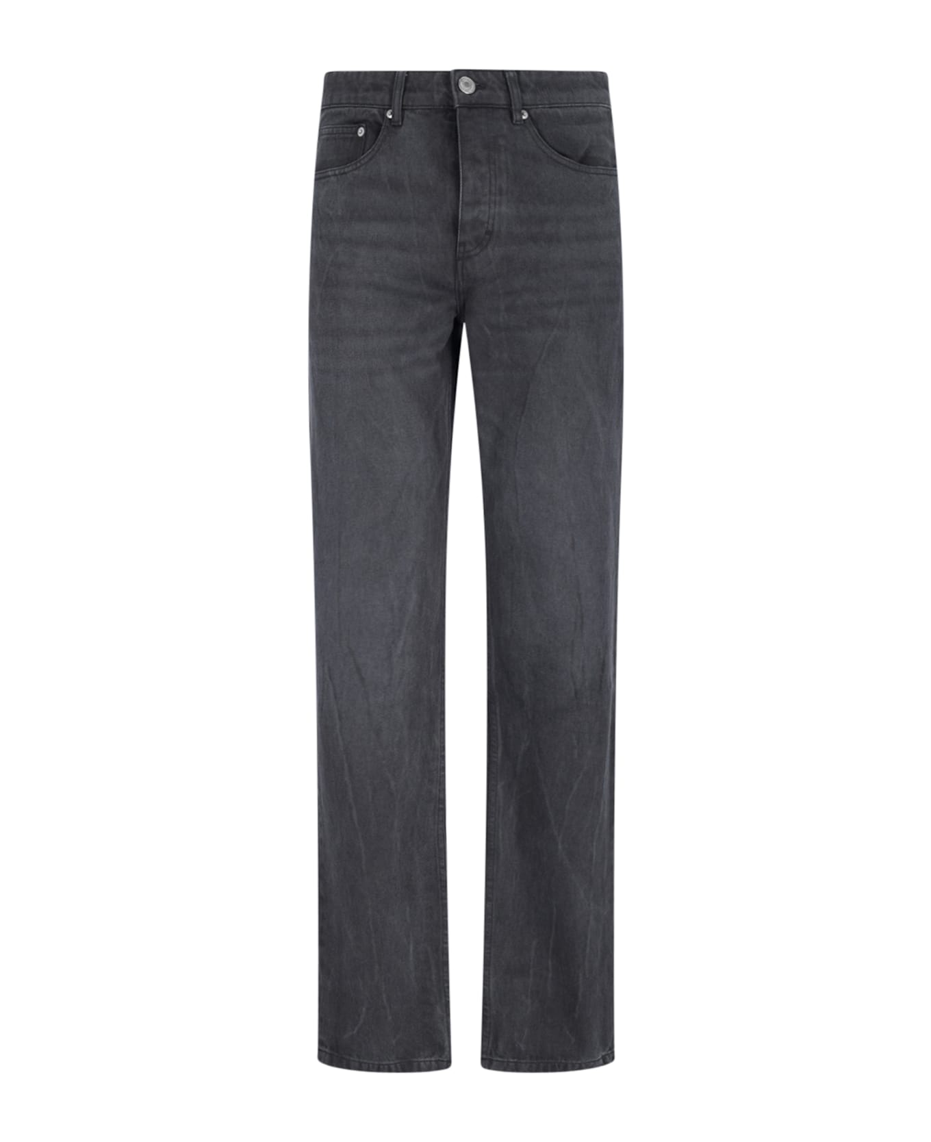 Ami straight jeans in black denim with mid waist, belt loops, button closure, five pocket design, beige logo patch on the back, straight leg. Composition: 100% Cotton
