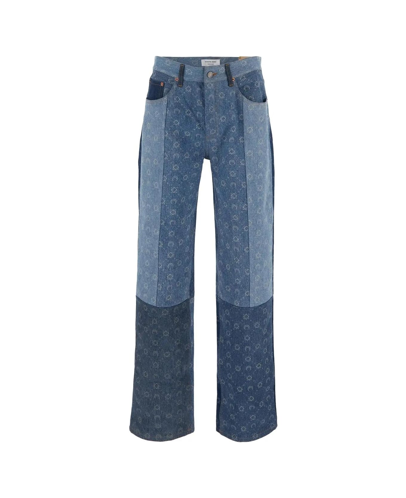 Marine Serre straight-leg jeans in blue denim cotton with different tones patchwork design, belt loops, five-pockets, a button fly, mid-waist and geometrical print pattern throughout.