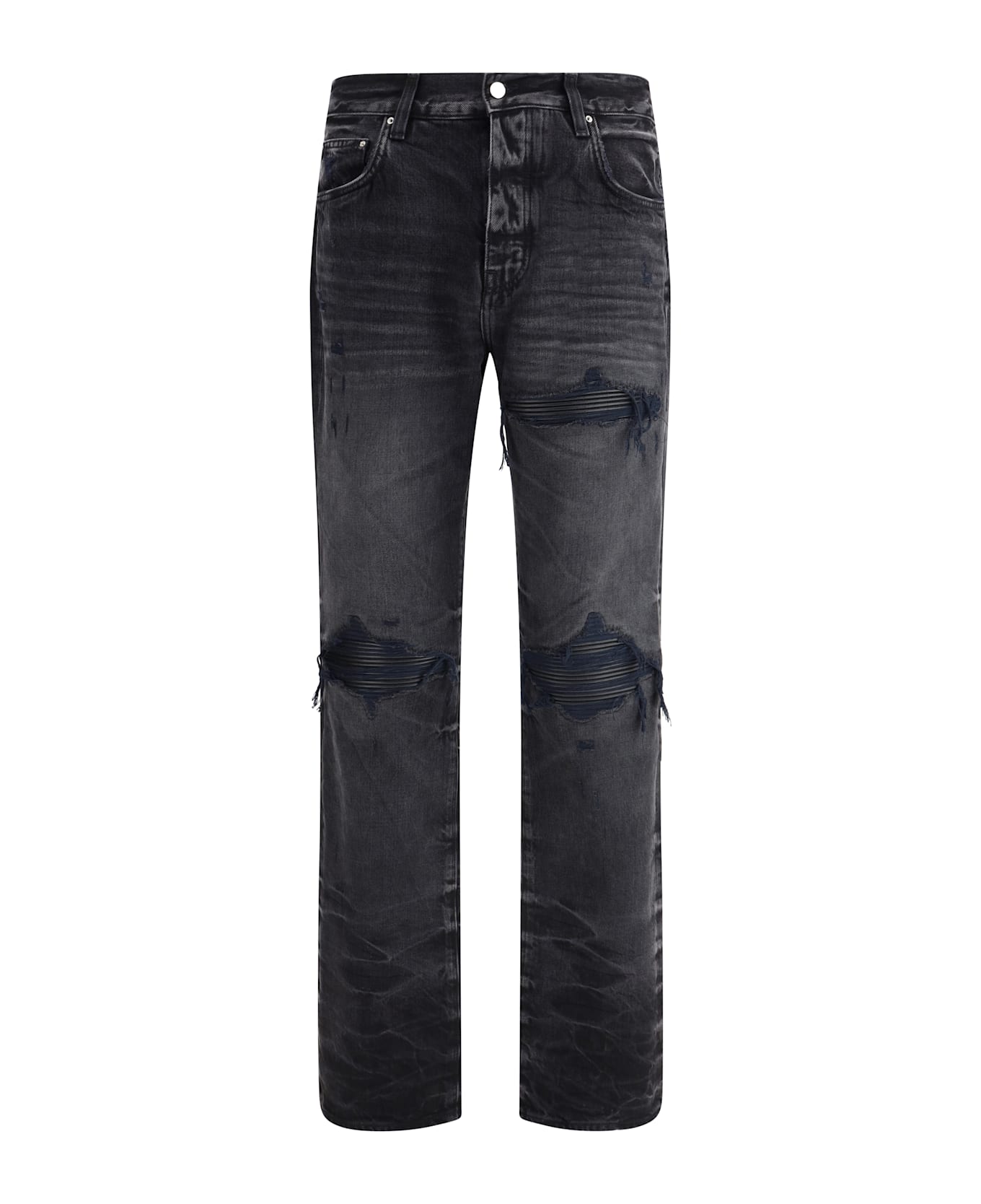 Amiri's mx1 cotton jeans express the brand's rock spirit and vintage aesthetic through refined details and premium materials. featuring a straight five-pocket design, they feature a front button closure and belt loops at the waist. the worn effect design with leather inserts gives a worn but sophisticated look, while a logoed leather patch, applied on the back, signs the garment with the unmistakable amiri identity. ideal for those who want a bold and authentic style.