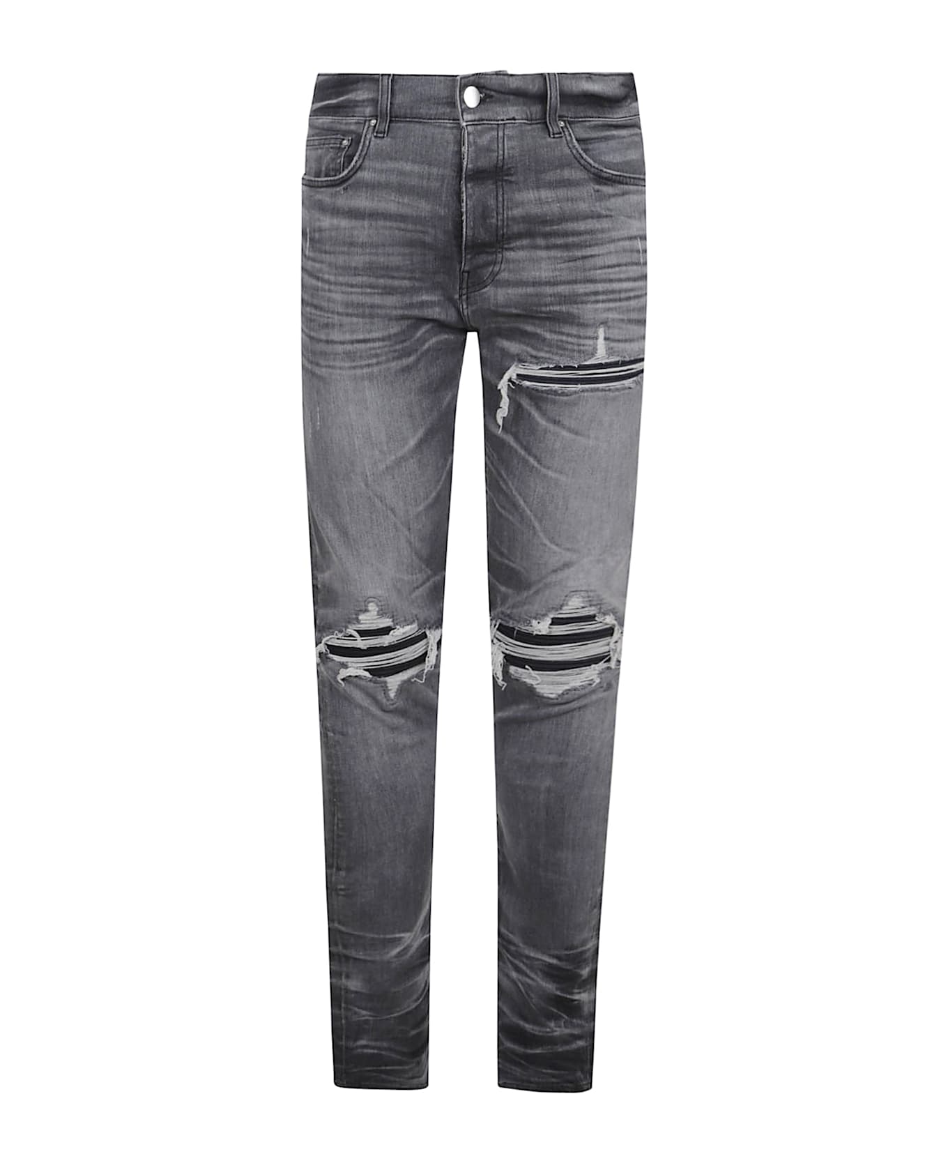 Amiri jeans featuring a front button and zip fastening, a grey colour, classic five pockets, ripped details and a logo patch on the back.