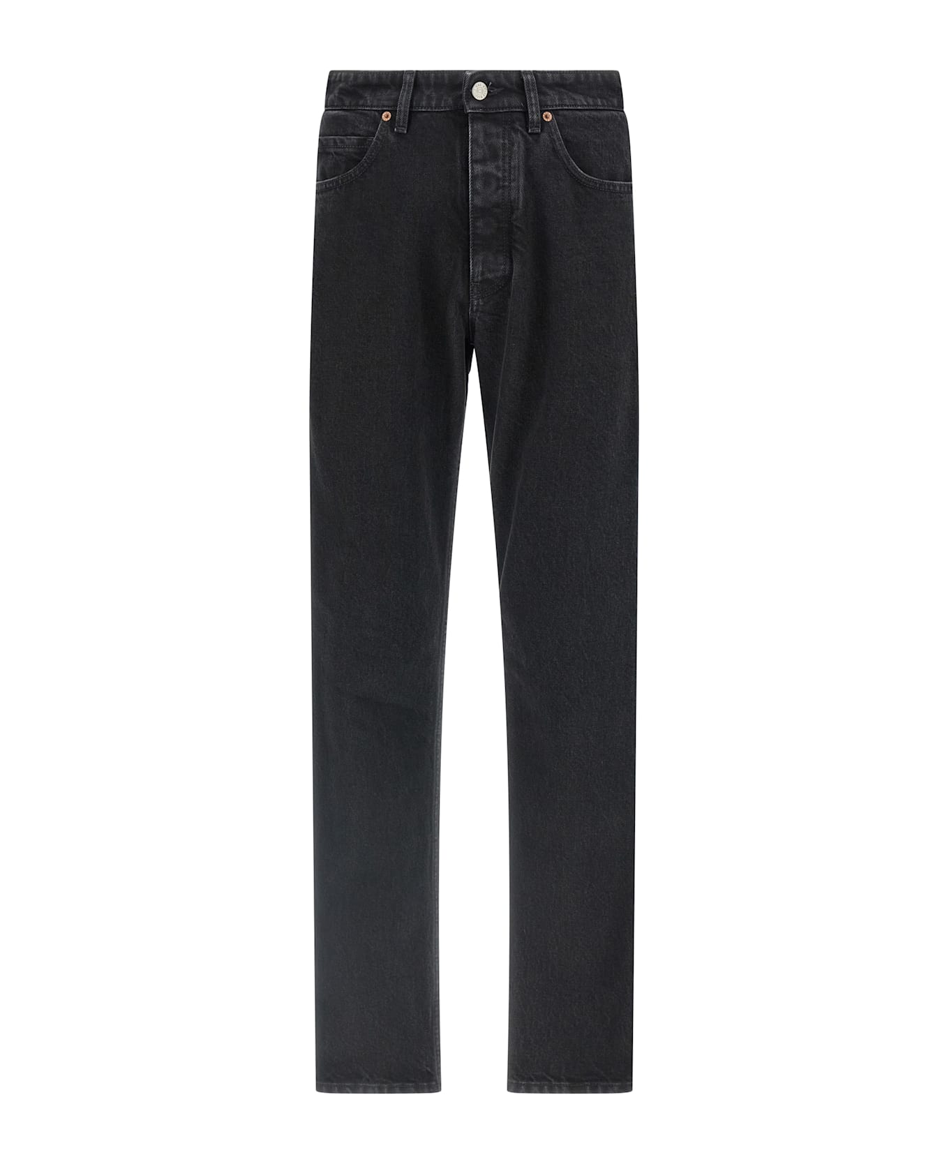 Garment-dyed cotton denim jeans with tone-on-tone side taped bands, straight leg, front button closure, five pockets, 'White stitch line' and tone-on-tone 'Numeric signature MM6' patch on the back.