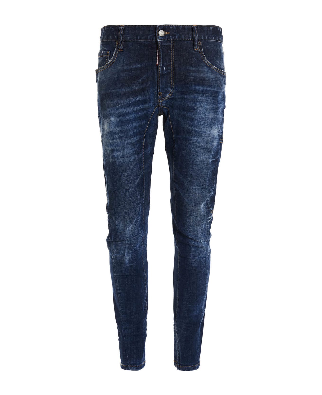 'Tidy Biker Jean' cotton denim jeans with button closure, five pockets, distressed details, back print and leather logo tag.