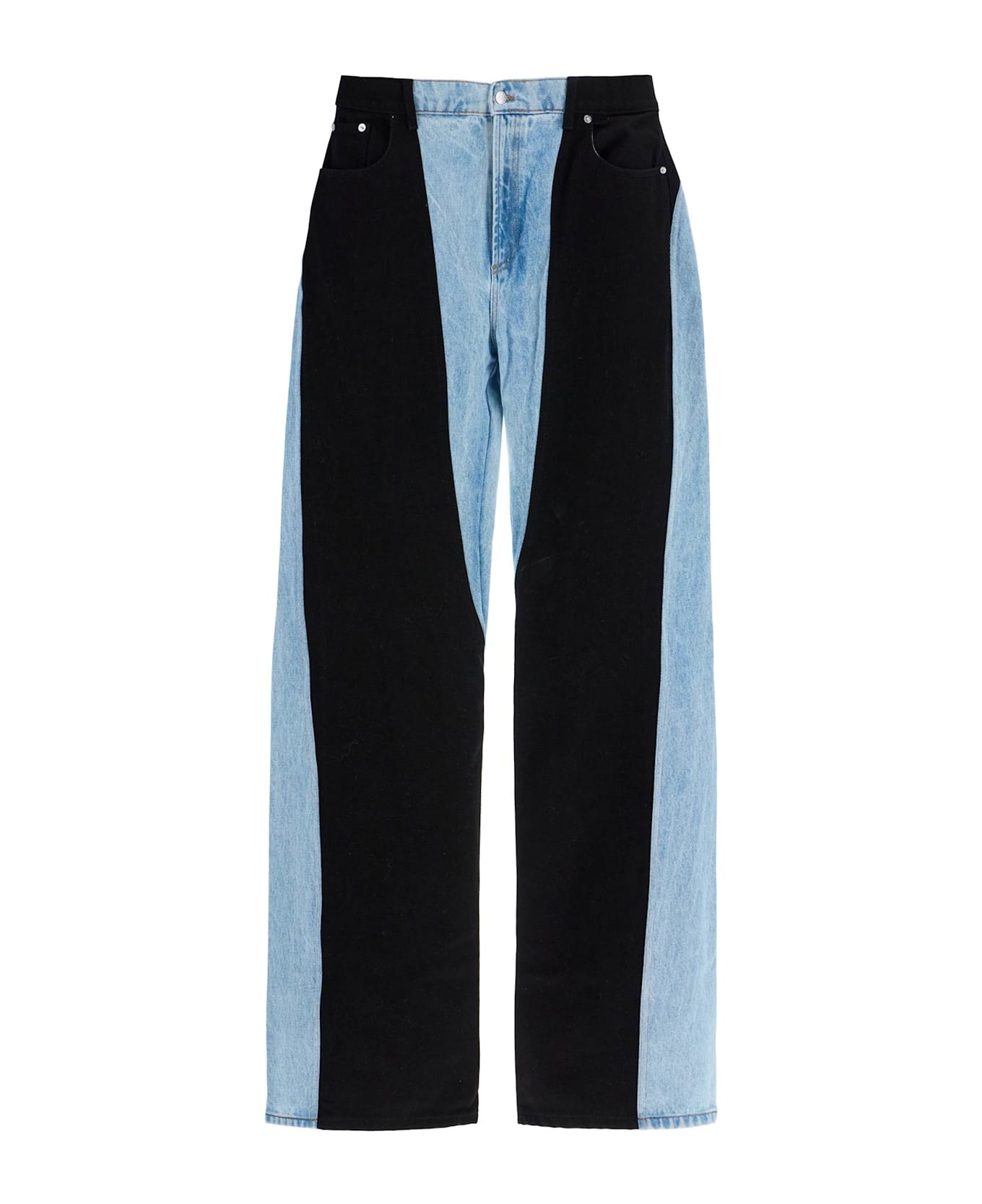 The Mugler jeans are made of bi-color organic cotton denim with panel construction. Featuring a five-pocket design, they have a back jacron, hidden zip and button closure, and a straight leg. The model is 182 cm tall and wears size 30.
