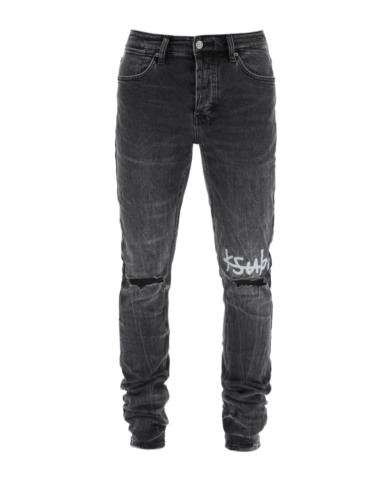 Van Winkle skinny jeans by Ksubi made of crinkle-effect stretch cotton denim with Ksubi print and slashes at the knees. Five-pocket design featuring button fly, cross back embroidery and iconic fabric tag sewn on the back pocket. The model is 187 cm tall and wears a size 31.