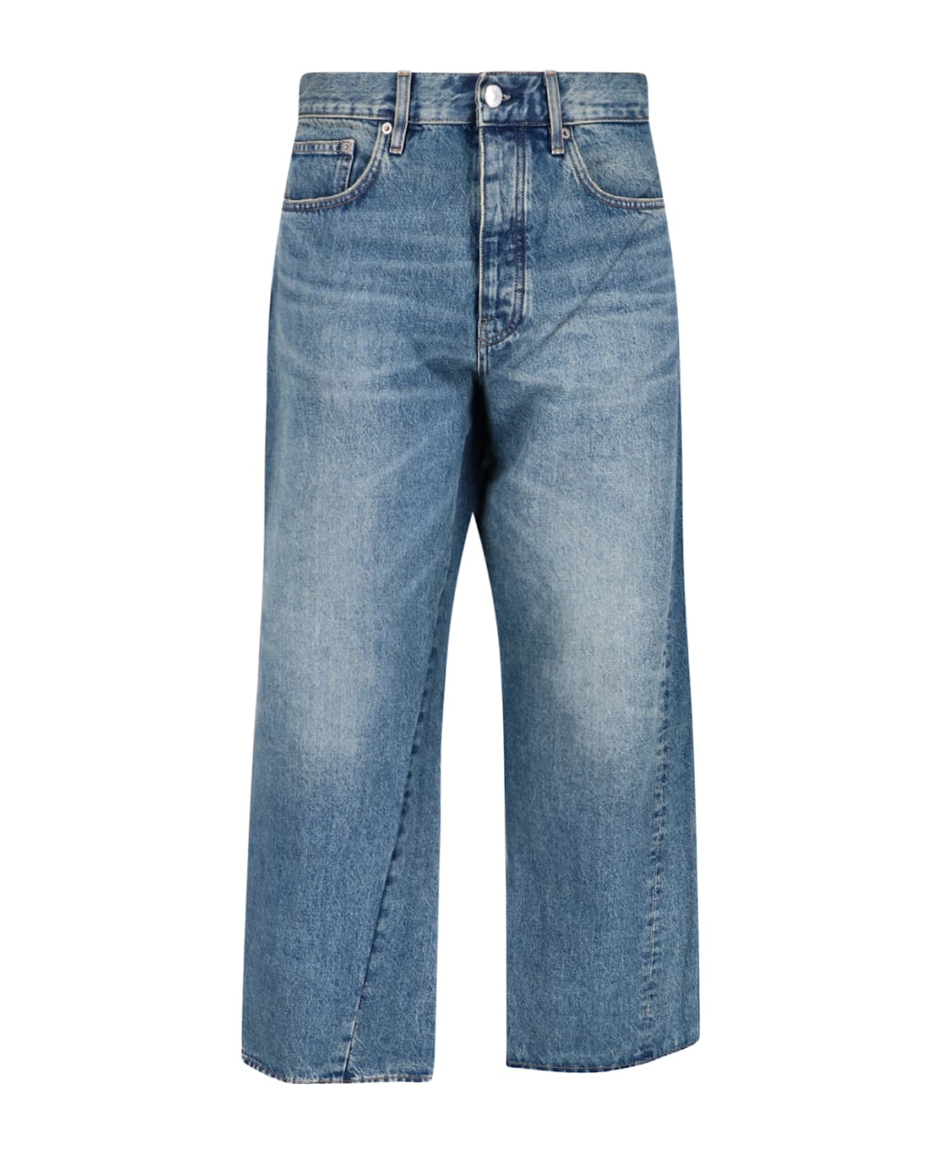 Sunflower Vintage wide jeans in light blue cotton denim with distressed effect, mid waist, belt loops, five-pocket design, button closure, leather logo patch on the back, and straight leg.