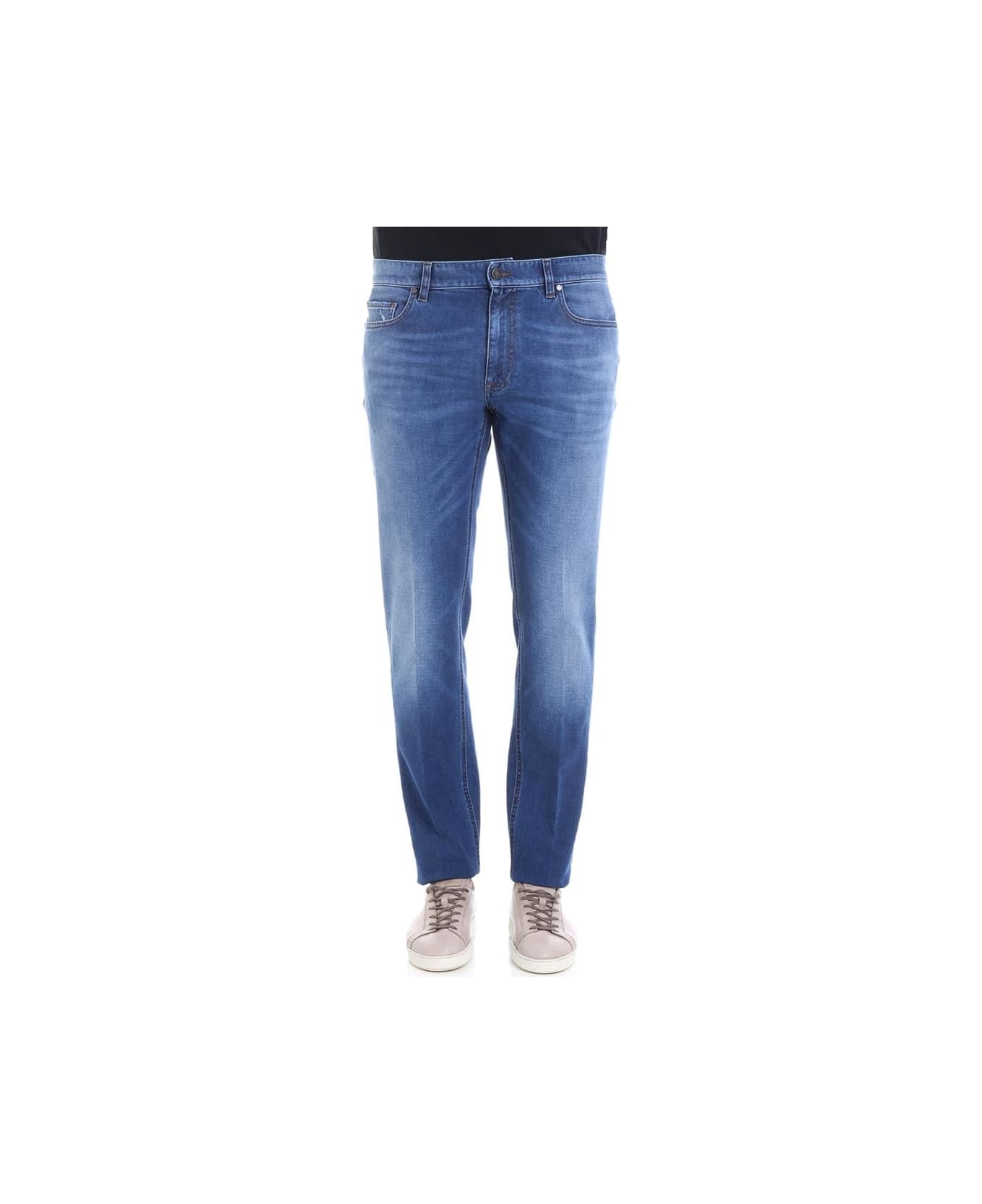 Z Zegna stretch cotton denim, washed blue, five pockets, logo detail on the back, slim fit, zip and button closure. Composition: 98% Cotton, 2% Eastan