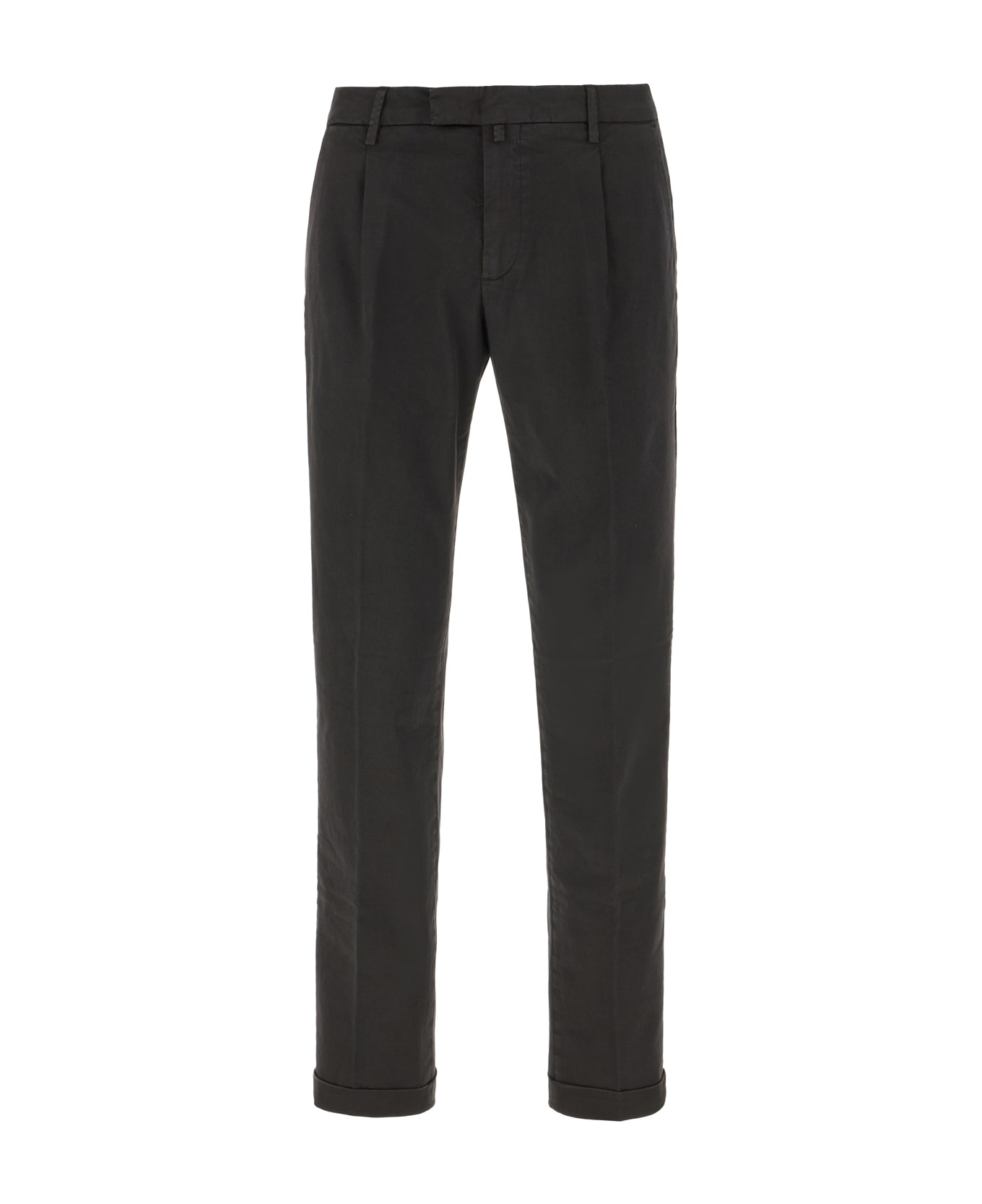 Pants realized in stretch cotton characterized by inverted pleats at the front. -Belt loops at the waist -Concealed zip with and button closure -Slant pockets, a slit pocket and two slit pockets at the back -Central ironed pleat -Folded hemline