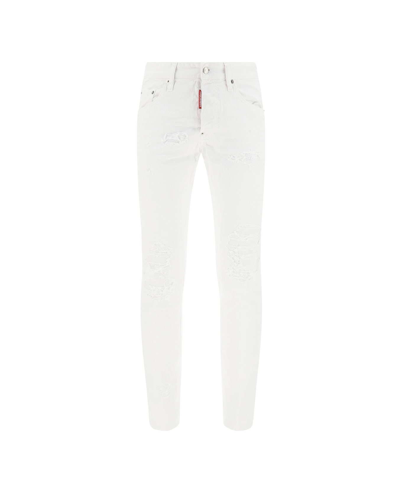 White Jeans from Dsquared2 Cotton jeans by dsquared2, concealed front button fastening, five-pocket skinny style, waistband loops, leather patch with iconic brand signature pressure-printed applique at back, distressed and torn vintage effect design.