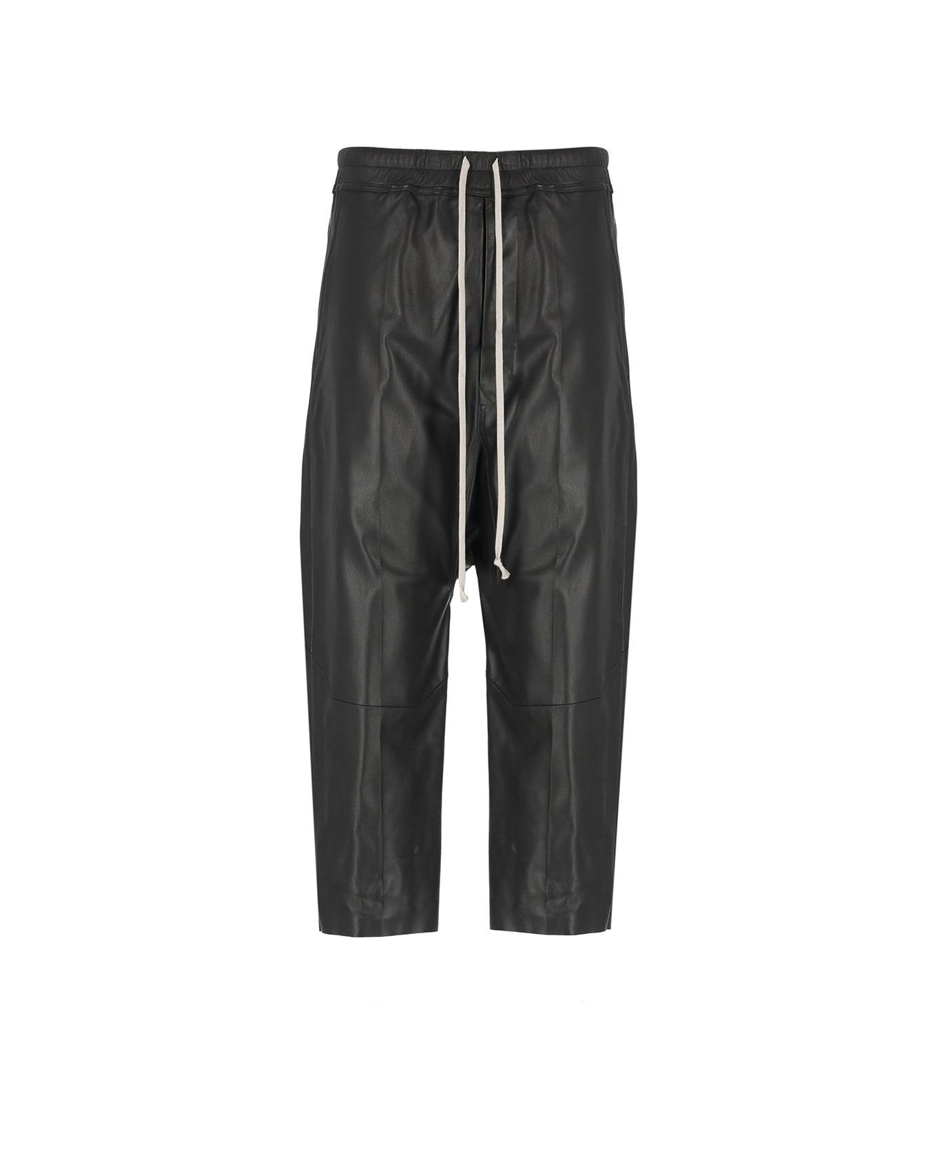 - Black Rick Owens smooth leather pants for man - Elastic at waist with drawstrings - Two side slit pockets - Two rear pockets with flap and buttons snap - Front buttons fastening - Dropped crotch