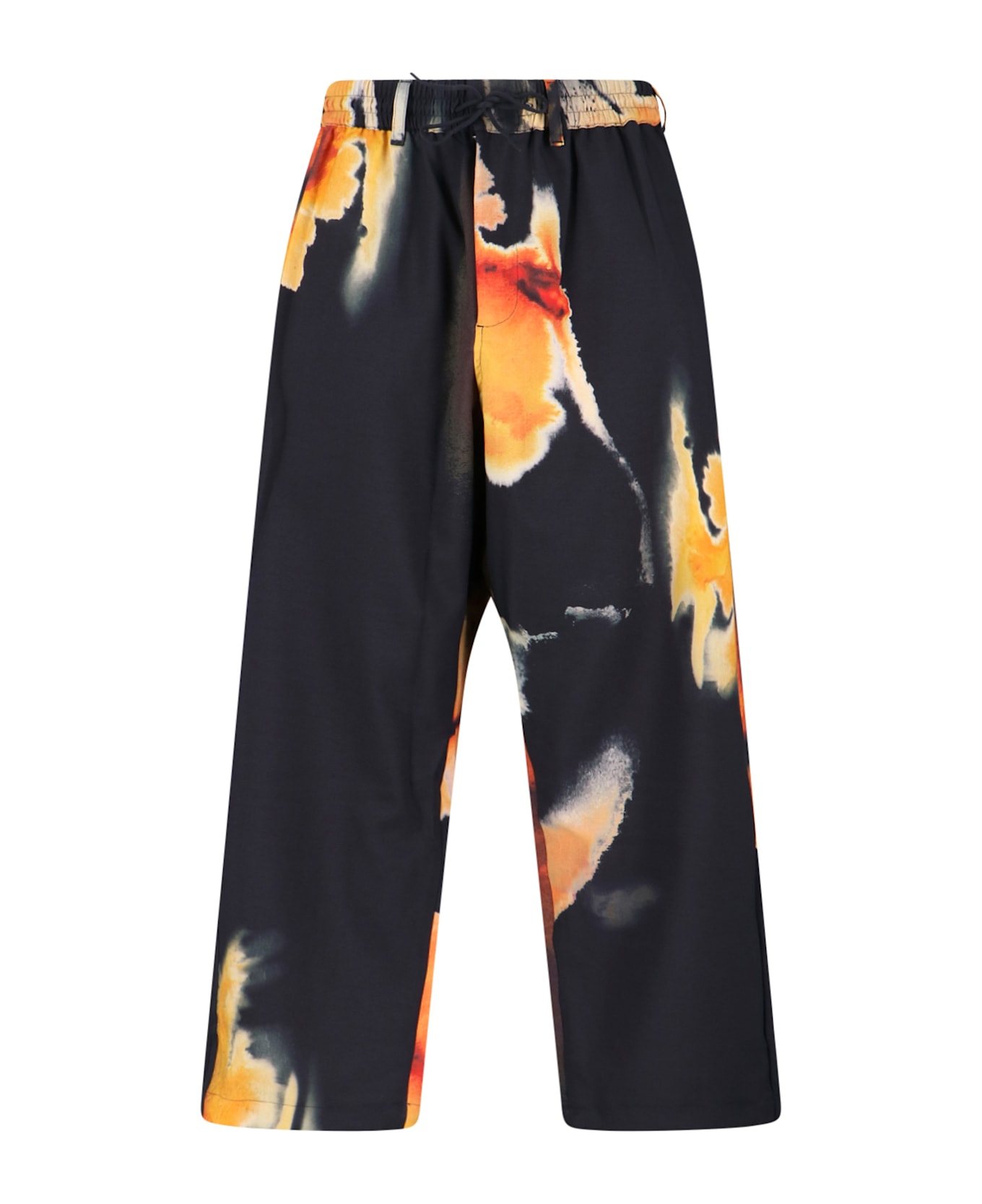 Y-3 Aop Sport Uniform Coach black fabric sports pants with all-over orange print pattern, medium elastic waistband, drawstring, button and zip closure, two side pockets, contrasting logo print at the back, two back pockets, straight leg.