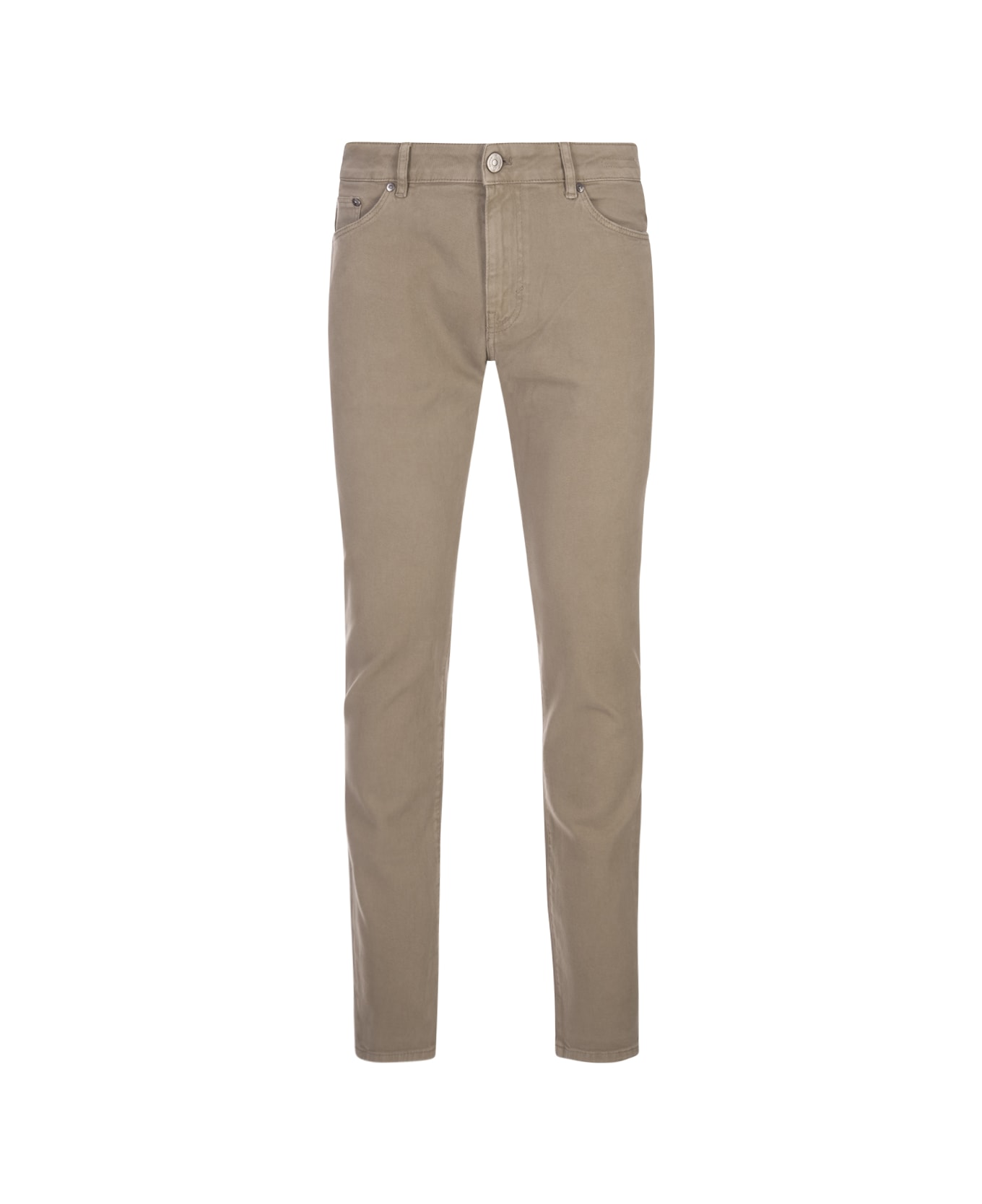PT05 slim fit jeans made from beige stretch cotton blend denim featuring a mid-rise waist, belt loops, a five pocket design, a zip and button fly and a contrasting back logo flap.