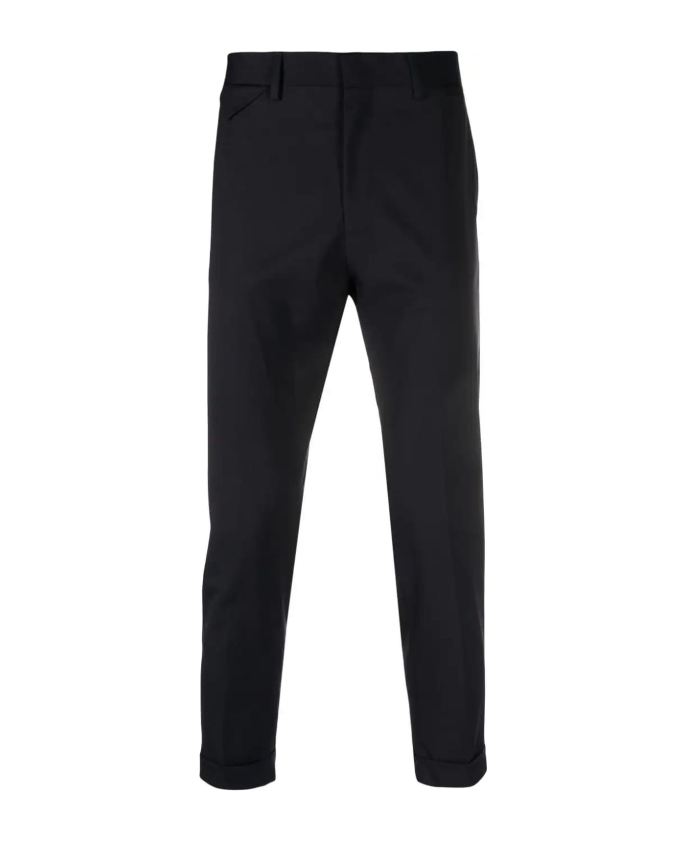 Blue virgin wool blend trousers, tailored design, belt loops, pleat detailing, concealed front fastening, slim cut, two side inset pockets, two rear jetted pockets, turn-up cuffs, ankle-length