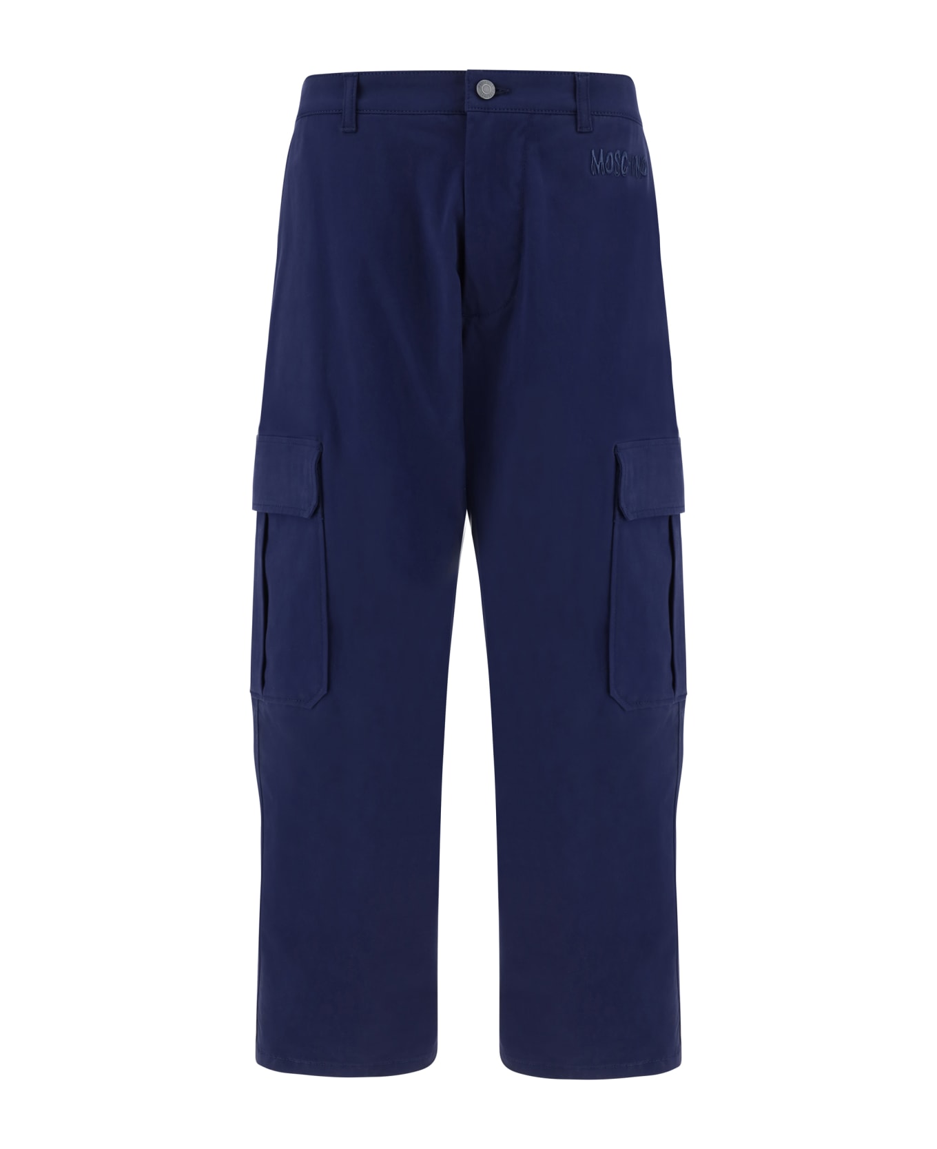 Cotton cargo pants by moschino, front button and zipper closure, two side slash pockets, two back patch pockets with snap button closure, large cargo patch pockets on side panels, belt loops waistband.