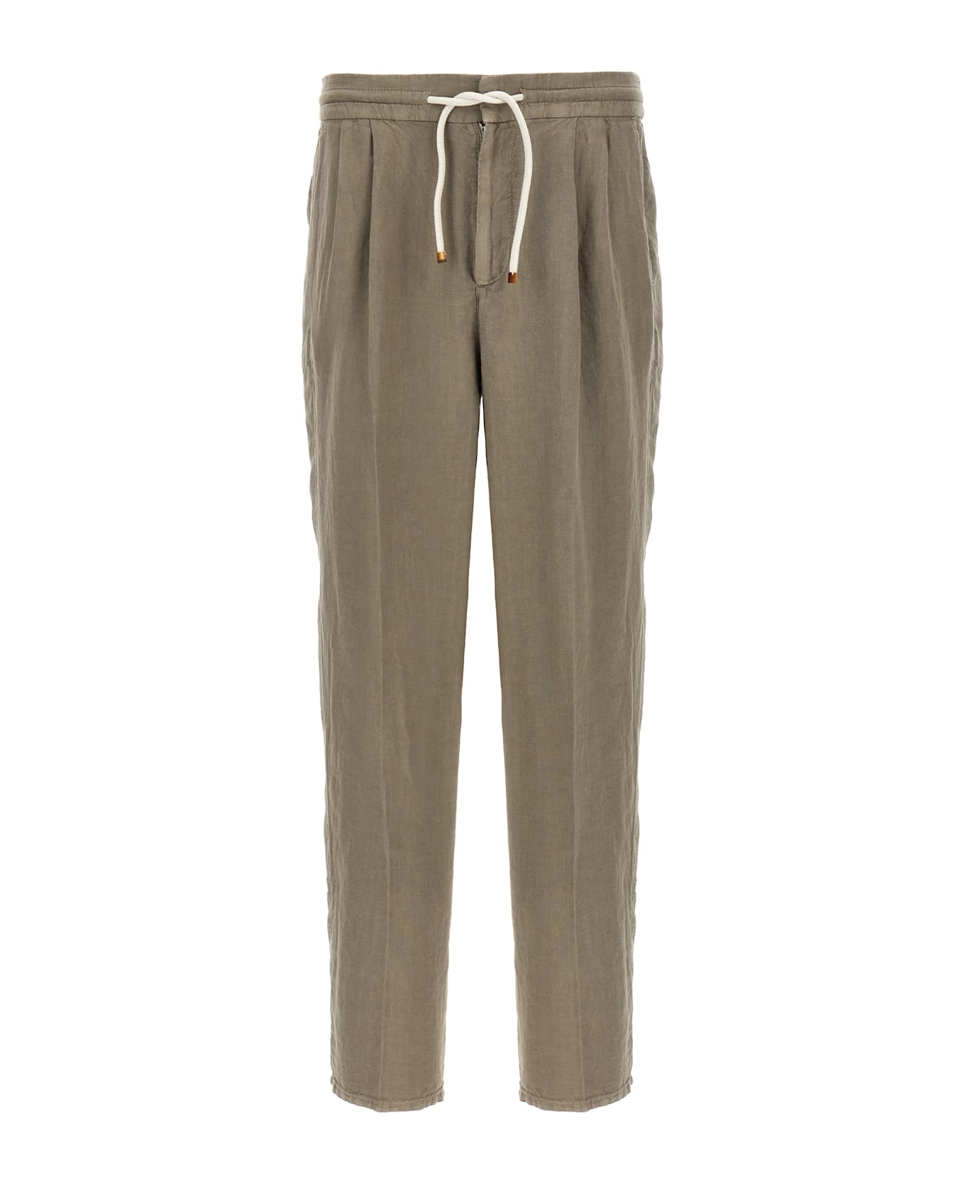 Garment-dyed linen pants, pinces, straight leg with stretched crease, hook and button zip closure, adjustable drawstring elastic at the waist, pockets. Composition: 100% linen