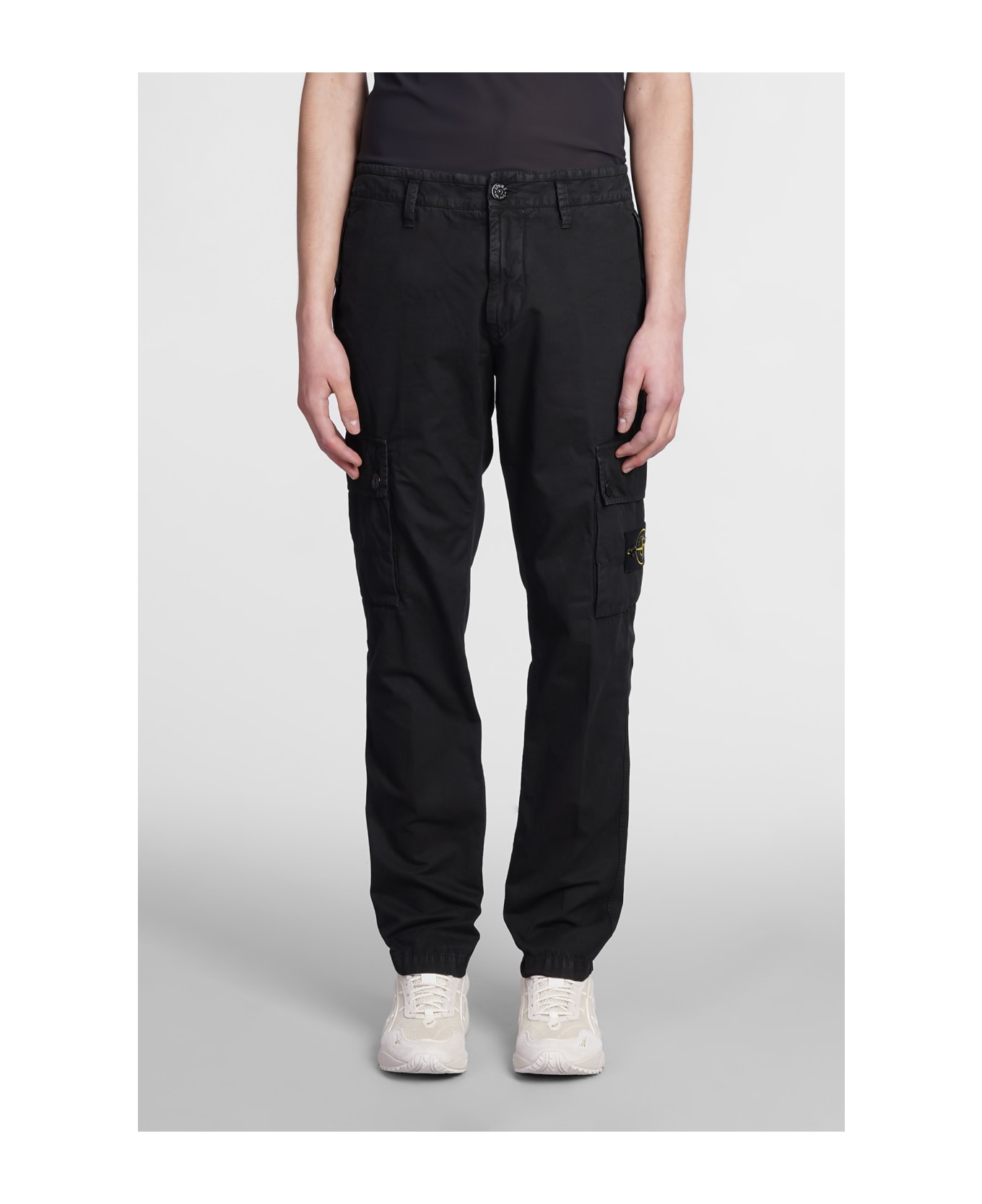 Pants in black cotton, button and zip closure, cargo pockets, side patch logo, 100% cotton, Made in Tunisia, Model is 1. 83 and wears size 31