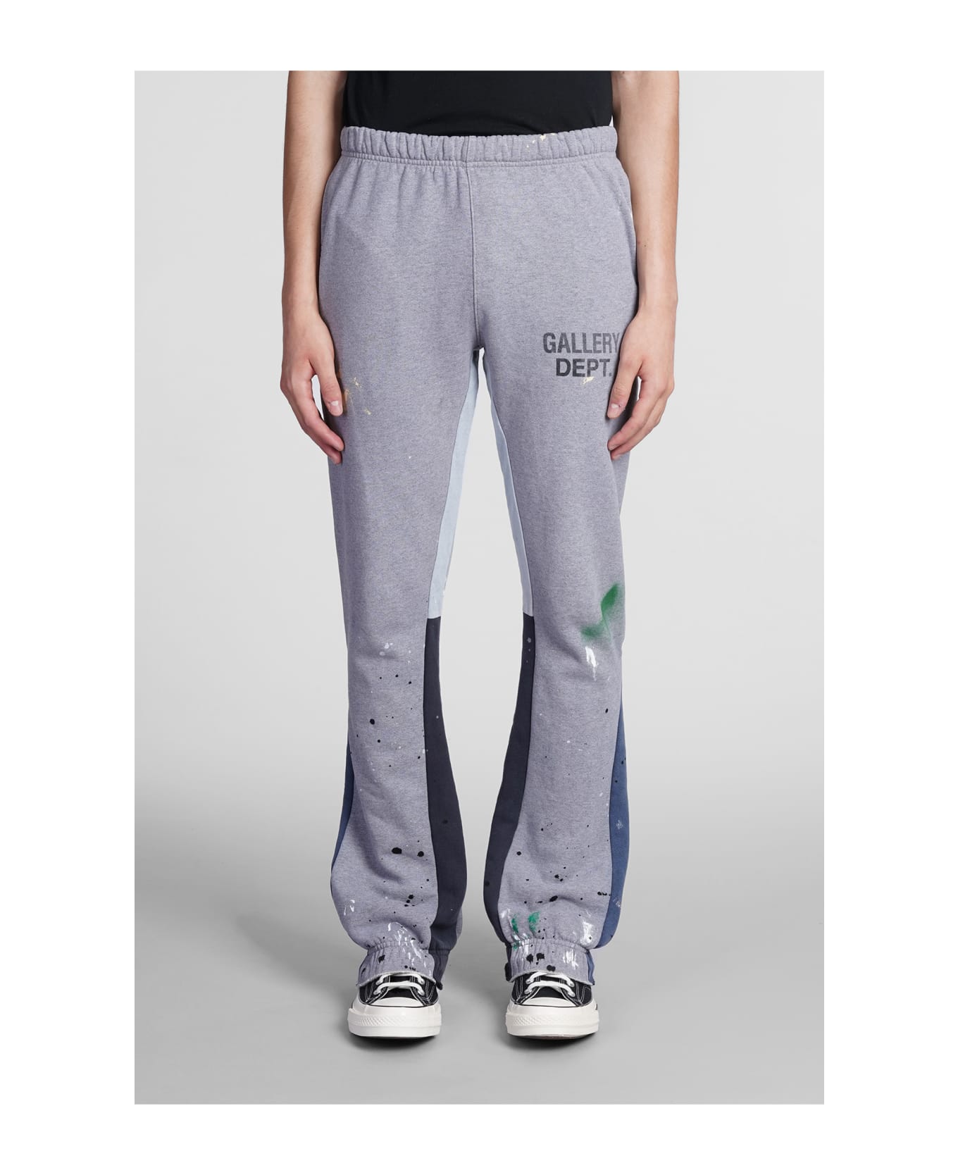 Pants in grey cotton, elastic waist, logo print on front, side bands, paint splashes effect, pockets, 100% cotton, Made in Usa, Model is 187 cm and wears size M