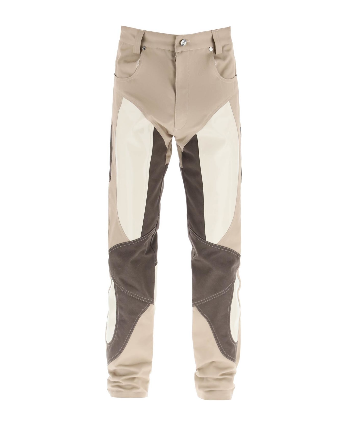 GmbH cotton pants enhanced by a color-block patchwork construction with vinyl inserts. Regular-fitting four-pocket design with tapered cut, featuring zip fly with branded button, belt loops and logo rivets. The model is 187 cm tall and wears a size 30.