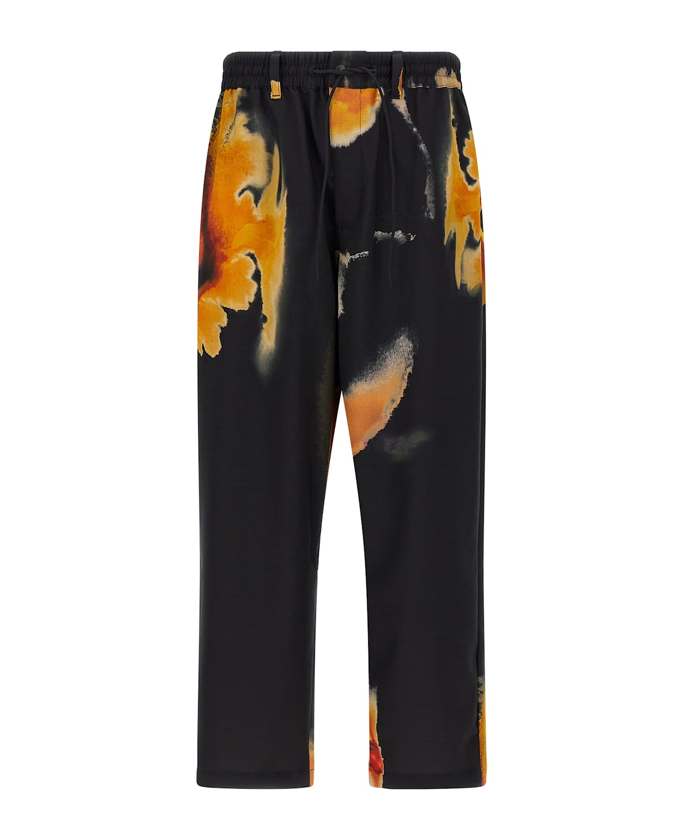 Printed technical fabric trousers, elastic waistband with adjustable drawstring, button and zip closure, pockets, back logo, adjustable elastic drawstring at the bottom. Composition: 100% polyethylene