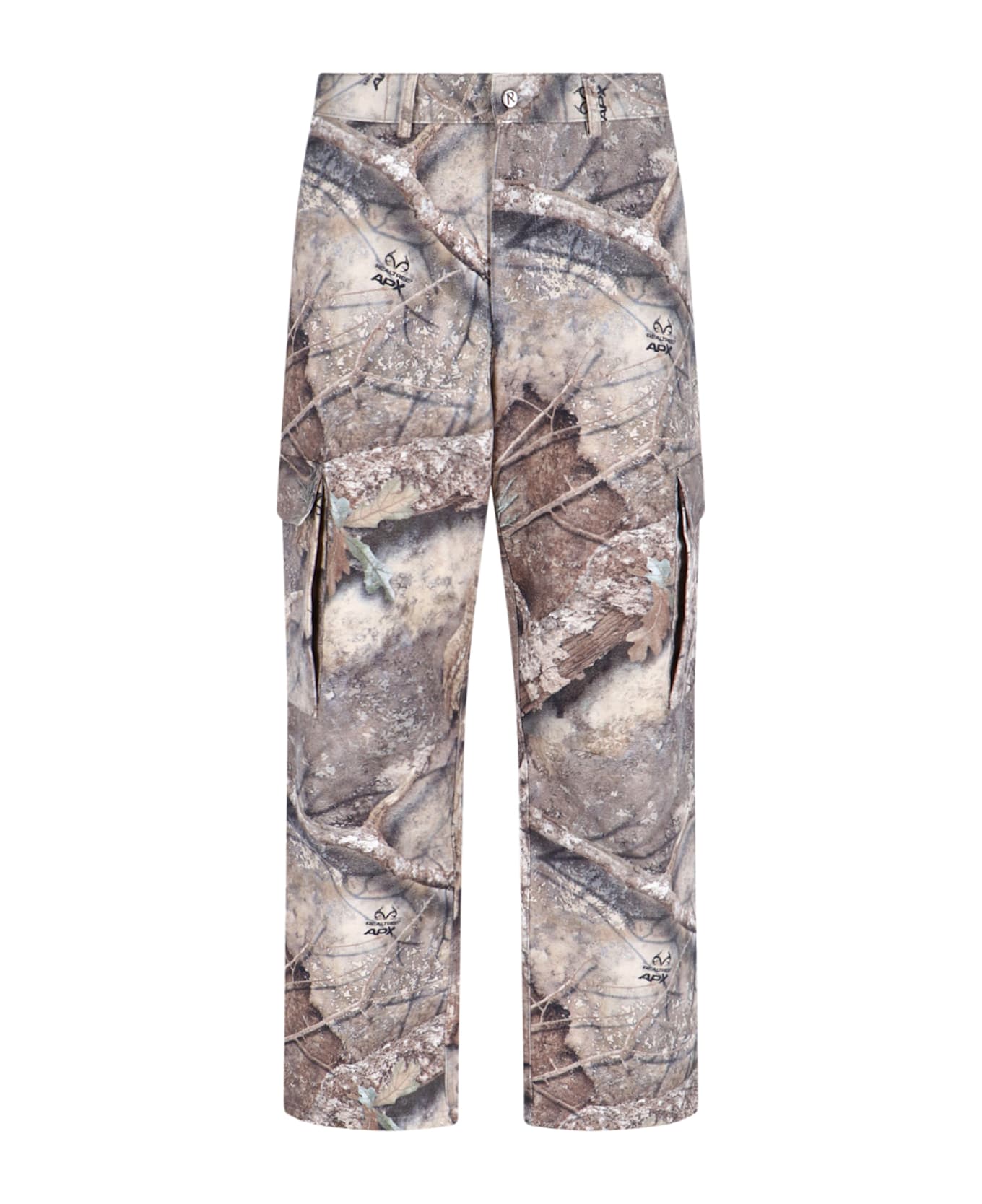 Represent 'Real tree camo' multicolor cotton pants with mid waist, belt loops, button and zip closure, all-over contrast logo, two front pockets, two side cargo pockets, two back pockets, contrast logo embroidery detail, straight leg.
