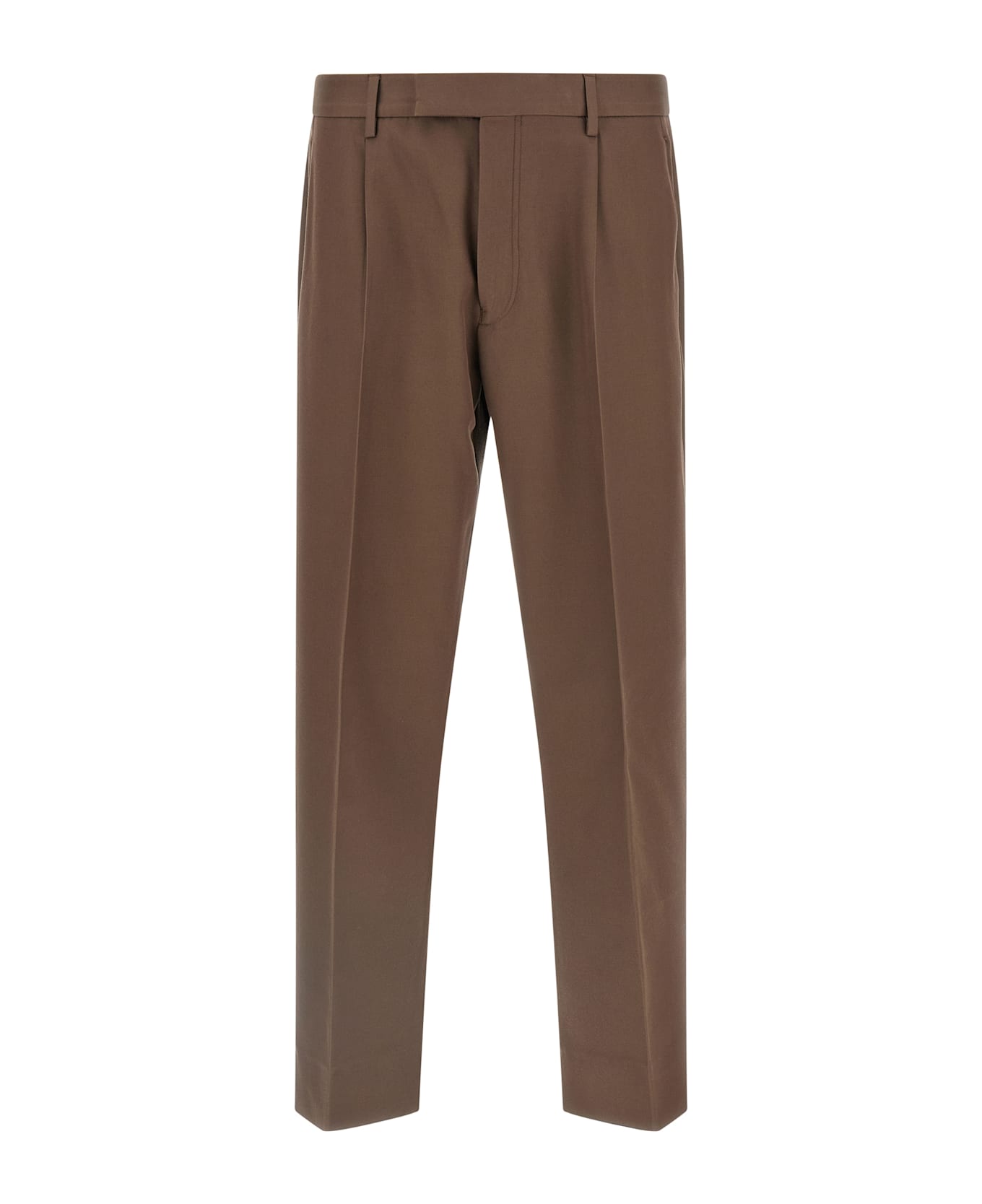 Heavy wool and cotton blend trousers, pins, ironed pleat, zip, hook and front button closure, pockets. Composition: 57% cotton, 43% wool