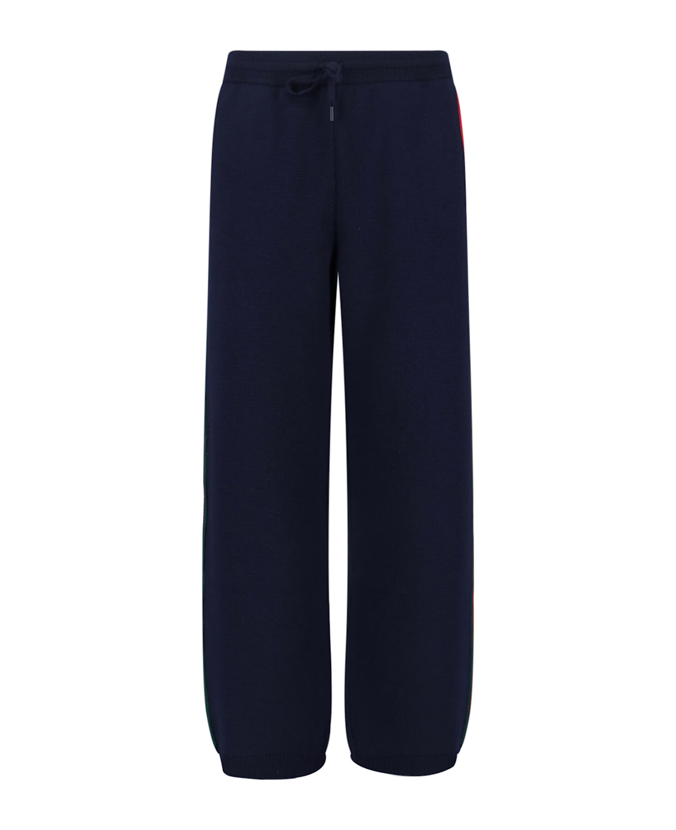 Gucci blue wool track pants with medium elastic waistband, adjustable drawstring at the waist, two side pockets, two-tone side web tape, back pocket, ribbed trim, elastic hems, straight leg. Composition: 100% Wool