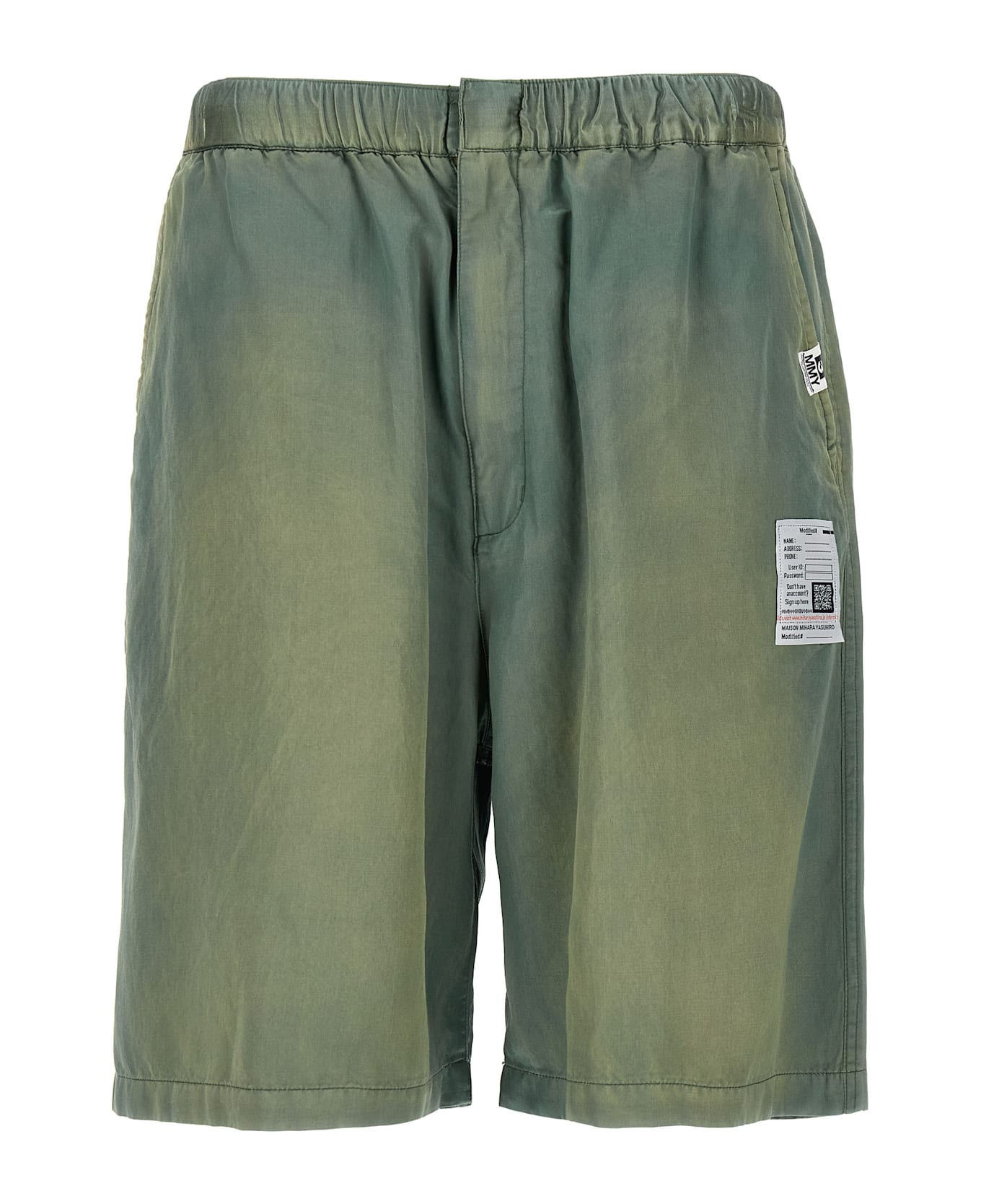 'Aged Satin' cotton and rayon blend bermuda shorts with used effect, vintage trim, front logo patch, adjustable drawstring elastic at the waist, zip and snap button flap, pockets.