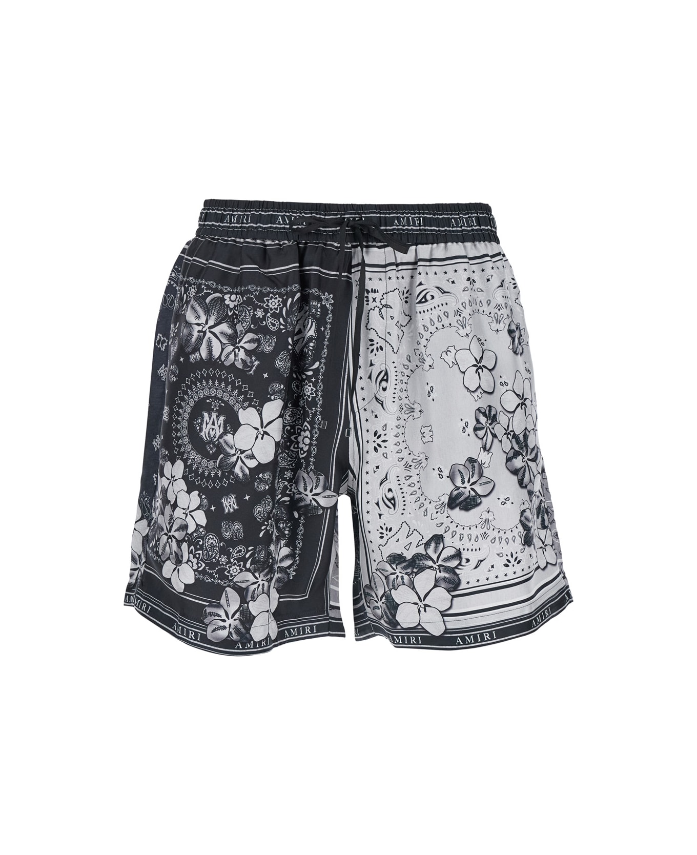 Shorts Black and white Elastic waistband Adjustable drawstring closure All-over Bandana print Silk Relaxed fit